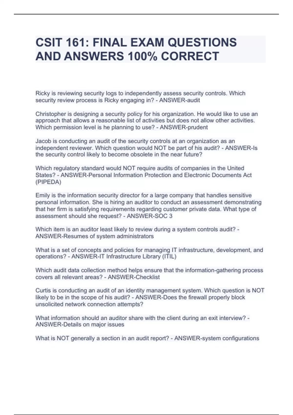 CSIT 161: FINAL EXAM QUESTIONS AND ANSWERS 100% CORRECTCSIT 161: FINAL EXAM QUESTIONS AND ANSWERS 100% CORRECTCSIT 161: FINAL EXAM QUESTIONS AND ANSWERS 100% CORRECTCSIT 161: FINAL EXAM QUESTIONS AND ANSWERS 100% CORRECTRicky is reviewing security logs to independently assess security controls. Which security review process is Ricky engaging in? - ANSWER-audit Christopher is designing a security policy for his organization. He would like to use an approach that allows a reasonable list of activities but does not allow other activities. Which permission level is he planning to use? - ANSWER-prudent Jacob is conducting an audit of the security controls at an organization as an independent reviewer. Which question would NOT be part of his audit? - ANSWER-Is the security control likely to become obsolete in the near future? Which regulatory standard would NOT require audits of companies in the United States? - ANSWER-Personal Information Protection and Electronic Documents Act (PIPEDA) Emily is the information security director for a large company that handles sensitive personal information. She is hiring an auditor to conduct an assessment demonstrating that her firm is satisfying requirements regarding customer private data. What type of assessment should she request? - ANSWER-SOC 3 Which item is an auditor least likely to review during a system controls audit? - ANSWER-Resumes of system administrators What is a set of concepts and policies for managing IT infrastructure, development, and operations? - ANSWER-IT Infrastructure Library (ITIL) Which audit data collection method helps ensure that the information-gathering process covers all relevant areas? - ANSWER-Checklist