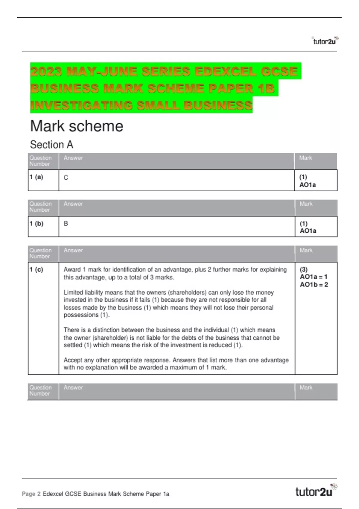 2023 MAY-JUNE SERIES EDEXCEL GCSE BUSINESS MARK SCHEME PAPER 1B INVESTIGATING SMALL BUSINESS Mark scheme Section A Question Number Answer Mark 1 (a) C (1) AO1a Question Number Answer Mark 1 (b) B (1) AO1a Question Number Answer Mark 1 (c) Award 1 mark for identification of an advantage, plus 2 further marks for explaining this advantage, up to a total of 3 marks. Limited liability means that the owners (shareholders) can only lose the money invested in the business if it fails (1) because they are not responsible for all losses made by the business (1) which means they will not lose their personal possessions (1). There is a distinction between the business and the individual (1) which means the owner (shareholder) is not liable for the debts of the business that cannot be settled (1) which means the risk of the investment is reduced (1). Accept any other appropriate response. Answers that list more than one advantage with no explanation will be awarded a maximum of 1 mark. (3) AO1a = 1 AO1b = 2 Question Number Answer Mark 1 (d) Award 1 mark for identification of a disadvantage, plus 2 further marks for explaining this disadvantage, up to a total of 3 marks. Interest payments on business loans are likely to increase (1), which means expenses increase (1), which could result in lower profits (1). Consumers are likely to spend less (1), as the cost of borrowing money increases (1) which means sales of the business may fall (1). Accept any other appropriate response. Answers that list more than one disadvantage with no explanation will be awarded a maximum of 1 mark. (3) AO1a = 1 AO1b = 2 Question Number Answer Mark 2 (a) B, C (2) AO1a Question Number Answer Mark 2 (b) A, E (2) AO1a Question Number Answer Additional guidance Mark 2 (c) Substitution into correct formula: (120 + 150 + 130 + 140) x £5 (1) Answer: = £2,700 (1) Award full marks for correct numerical answer without working. Do not accept any other answer (2) AO2 Question Number Answer Mark 2 (d) Award 1 mark for identification of a reason, plus 2 further marks for explaining this reason, up to a total of 3 marks. To generate sales (1). This is because if the business understands customer needs and provides goods/services of the price/quality that customers want (1) customers are more likely to make a purchase (1). To survive (1). This is because if the business provides the customer with choice/ convenience (1) it is more likely to be able to generate sales (1). Accept any other appropriate response. Answers that list more than one reason with no explanation will be awarded a maximum of 1 mark. (3) AO1a = 1 AO1b = 2 Question Number Answer Mark 2 (e) Award 1 mark for identification of one benefit, plus 2 further marks for explaining this benefit, up to a total of 3 marks. Crowd funding can generate assistance (1) because investors may offer skills/ experience (1), which means the business is more likely to be successful (1). Crowd funding may generate publicity (1) which means the business is more likely to generate sales (1) which means it is more likely to succeed (1). Accept any other appropriate response. Answers that list more than one benefit with no explanation will be awarded a maximum of 1 mark. (3) AO1a = 1 AO1b = 2 Question Number Answer Mark 3 (a) C (1) AO1a Question Number Answer Additional guidance Mark 3 (b) Substitution into correct formula: Interest (on loans) = (£360 x 12 x 5) - £20,000 £20,000 (1) Answer: 8.00 % (1) Award full marks for correct numerical answer without working. Do not accept any other answer. (2) AO2 Question Number Answer Mark 3 (c) Award 1 mark for identification of a benefit, plus 2 further marks for explaining this benefit, up to a total of 3 marks. Sales may increase (1), because customers will find it quicker and more convenient using card payments (1), this means they are more likely to come back and buy other things from the business (1). Costs are reduced (1), because payments into the business can be made faster (1), reducing the need for an overdraft (1). Accept any other appropriate response. Answers that list more than one benefit with no explanation will be awarded a maximum of 1 mark. (3) AO1a = 1 AO1b = 2