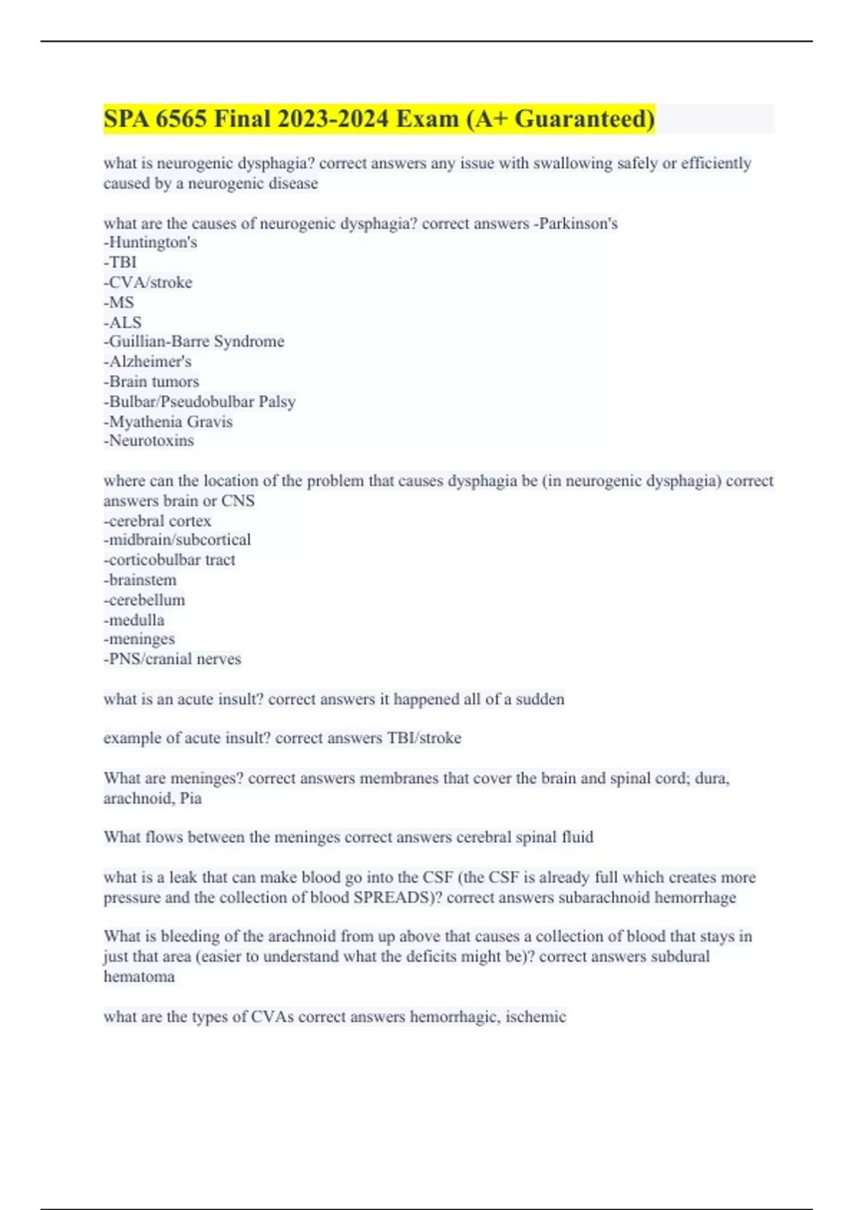 what is neurogenic dysphagia? correct answers any issue with swallowing safely or efficiently caused by a neurogenic disease what are the causes of neurogenic dysphagia? correct answers -Parkinson's -Huntington's -TBI -CVA/stroke -MS -ALS -Guillian-Barre Syndrome -Alzheimer's -Brain tumors -Bulbar/Pseudobulbar Palsy -Myathenia Gravis -Neurotoxins where can the location of the problem that causes dysphagia be (in neurogenic dysphagia) correct answers brain or CNS -cerebral cortex -midbrain/subcortical -corticobulbar tract -brainstem -cerebellum -medulla -meninges -PNS/cranial nerves what is an acute insult? correct answers it happened all of a sudden example of acute insult? correct answers TBI/stroke What are meninges? correct answers membranes that cover the brain and spinal cord; dura, arachnoid, Pia What flows between the meninges correct answers cerebral spinal fluid what is a leak that can make blood go into the CSF (the CSF is already full which creates more pressure and the collection of blood SPREADS)? correct answers subarachnoid hemorrhage What is bleeding of the arachnoid from up above that causes a collection of blood that stays in just that area (easier to understand what the deficits might be)? correct answers subdural hematoma what are the types of CVAs correct answers hemorrhagic, ischemic