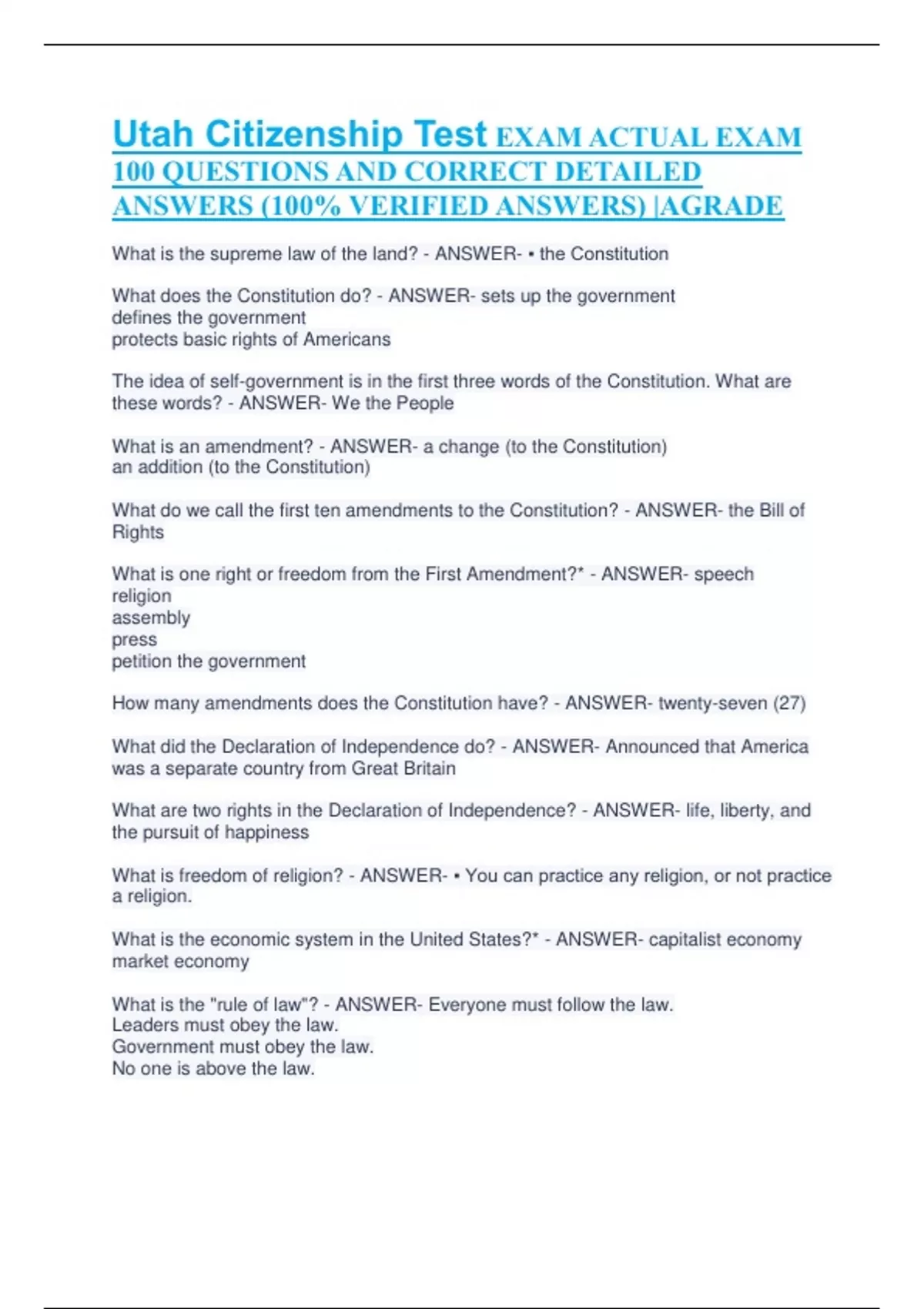 Utah Citizenship Test EXAM ACTUAL EXAM 100 QUESTIONS AND CORRECT DETAILED ANSWERS (100% VERIFIED ANSWERS) |AGRADE What is the supreme law of the land? - ANSWER- ▪ the Constitution What does the Constitution do? - ANSWER- sets up the government defines the government protects basic rights of Americans The idea of self-government is in the first three words of the Constitution. What are these words? - ANSWER- We the People What is an amendment? - ANSWER- a change (to the Constitution) an addition (to the Constitution) What do we call the first ten amendments to the Constitution? - ANSWER- the Bill of Rights What is one right or freedom from the First Amendment?* - ANSWER- speech religion assembly press petition the government How many amendments does the Constitution have? - ANSWER- twenty-seven (27) What did the Declaration of Independence do? - ANSWER- Announced that America was a separate country from Great Britain What are two rights in the Declaration of Independence? - ANSWER- life, liberty, and the pursuit of happiness What is freedom of religion? - ANSWER- ▪ You can practice any religion, or not practice a religion. What is the economic system in the United States?* - ANSWER- capitalist economy market economy What is the "rule of law"? - ANSWER- Everyone must follow the law. Leaders must obey the law. Government must obey the law. No one is above the law. Name one branch or part of the government.* - ANSWER- ▪ Congress ▪ legislative ▪ President ▪ executive ▪ the courts ▪ judicial What stops one branch of government from becoming too powerful? - ANSWERchecks and balances separation of powers Who is in charge of the executive branch? - ANSWER- the President Who makes federal laws? - ANSWER- Congress ▪ Senate and House (of Representatives) ▪ (U.S. or national) legislature What are the two parts of the U.S. Congress?* - ANSWER- the Senate and House (of Representatives) How many U.S. Senators are there? - ANSWER- one hundred (100) We elect a U.S. Senator for how many years? - ANSWER- six (6) Who is one of your state's U.S. Senators now?* - ANSWER- Mitt Romney, Mike lee The house of representatives has how many voting members? - ANSWER- 435