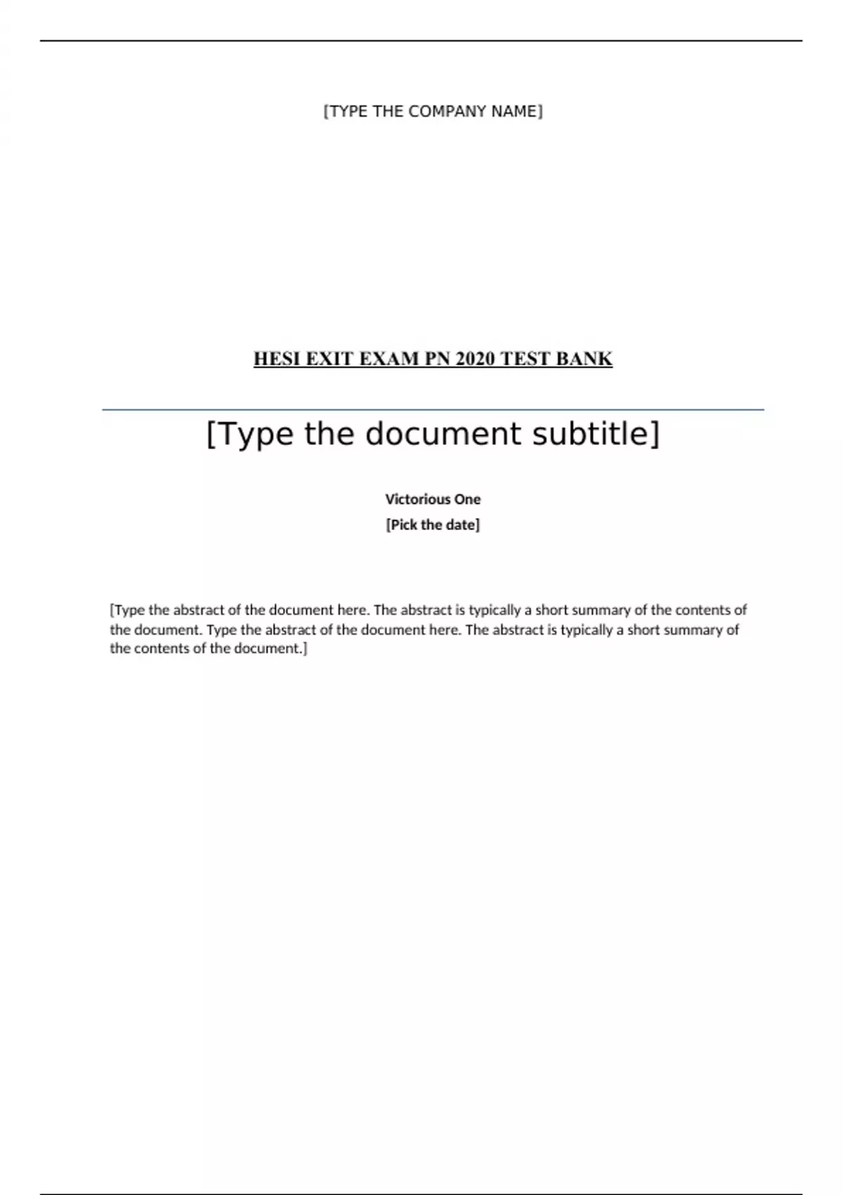 [TYPE THE COMPANY NAME] HESI EXIT EXAM PN 2020 TEST BANK [Type the document subtitle] Victorious One [Pick the date] [Type the abstract of the document here. The abstract is typically a short summary of the contents of the document. Type the abstract of the document here. The abstract is typically a short summary of the contents of the document.] HESI EXIT EXAM PN 2020 TEST BANK 1. a male client admitted the morning of his scheduled surgery tells the PN that he drank water last night. What intervention will the PN implement first? Determine the amount of water and exact time it was taken 2. A client receives ondansetron prior to chemotherapy treatment.How should the PN evaluate this medication? Monitor the client for nausea or vomiting following the treatment 3. The PN is caring for an older adult client who is confused and spends...factor contributes to an increased risk for impaired skin integrity for this client? Has increasing episodes of urinary incontinence 4. The pn determines that a client with cirrhosis is experiencing peripheral....take? Protect the clients feet from injury 5. A client is admitted to the postoperative surgical unit after a left lobectomy with two chest tubes......observes the water-sealed chambers, set and prescribed suction of 20cm water...what action should the PN implement? Maintain system integrity and to promote lung reexpansion 6. photo of chest and locating apical HR just below the left nipple 7. At the end of a 12-hour shift the PN observes the urine in a clients drainage..what action should the PN take next? note the most recent white blood count 8. Thirty minutes after receiving IV morphine, a postoperative male client continue to rate his pain...what action should the PN implement first? implement complementary pain relief methods 9. A male client has been diagnosed with schizophrenia is withdrawn, isolates himself in....with one or two word responses. the morning the PN observes that he...Which intervention is most important for the PN to implement? Measure appropriate vital signs 10. The PN is assisting a female client to obtain a voided specimen for uri...meatus. Which intervention is performed next? initiate the urine stream? 11. An 8-year old is placed in 90-90 traction for a fractured femur that resulted from...further action by the PN? weights are touching the foot of the bed 12. The PN is reviewing diet instructions with a female client who has hyper...she has increased her intakes of protein and calories. What action should the PN take? Encourage the client to continue the dietary changes she has made 13. The PN reviews the procedure for measuring fluid intake and output ...glomerulonephritis and is preparing for discharge from the hospital. What... -why the fluid measurements need to be recoded 14. -which food types are included when measuring fluid take 15. -what container to use for the most accurate measurement 16. ... request return visit for examination after her period when hormones are lowest 17. A mother brings her 5-year old child to the clinic for school physical examinations. Which assessment... PN that intergenerational violence may be occurring in the home? -The 6-year old son hits his younger sister during the interview 18. -the 10-year old daughter has circular burns on her trunk and legs 19. -the 3-year old has multiple bruises on the chest and both legs 20. A client has a prescription to discontinue intravenous therapy when the liter that is infusing at 150 mL per hour is...1200 the PN notes that there are 750 ml of solution remaining.At what time should the nurse expect to discontinue the intravenous therapy? 1700 21. the PN is caring for a client who had a total laryngectomy, left radical neck dissection... client is receiving nasogastric tube feedings via an internal pump. today the rate of the feeding was increased...ml/hr. What parameter should the PN use to evaluate the clients tolerate to the rate of the feeding? gastric residual volumes 22. A new mother is breastfeeding her newborn for the first time after delivery and complains of nipple pain...Based on the client complaint, what action should the PN take? Ensure that all the areolar tissue of the nipple is in the infants mouth. 23. Which site should the PN use when administering an injection of Rho (D) Immune negative postpartum client? deltoid 24. Before inserting medication into a clients vagina, what instructions should the pn... urinate until bladder is empty 25. An 18-year old female client with pelvic inflammatory disease (PID0 asks the pn..Which information is best for the PN to provide? A history of untreated gonnorhea can lead to PID 26. A new mother is bottle feeding instead of breastfeeding her newborn, The PN...most effectively deal with breast engorgement and discomfort? Wear a supportive bra at all times 27. A young adult male tells the PN he has declared to change his hours at work so that he can...his community. Which stage of Maslow's development is this young adult attempting to achieve? Self-actualiztion 28. A female client arrives to the clinic for an annal physical examination. when reviewing...the PN that she takes herbs for high blood pressure instead of the prescribed..important for the PN to reinforce with the client? Explain risks associated with using herbs instead of the prescribed antihypertensives. 29. A female Native American client who is receiving chemotherapy places a native artifact...the health care provider removes the medicine wheel and tells the client "this type..hospital" what intervention should the PN implement ? Act as the clients advocate when discussing the issue with the HCP 30. The PN is caring for a client receiving chemotherapy who has thrombocytopenia..important to include in the nursing care plan? watch the client for abnormal bleeding 31. ... "it is better to obtain children acetaminophen to prevent possible side effects from the aspirin " 32. A client is transferred to the surgical unit from the intensive care 