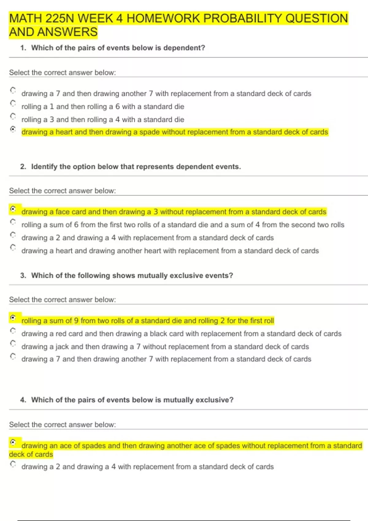 MATH 225N WEEK 4 HOMEWORK PROBABILITY QUESTION AND ANSWERS