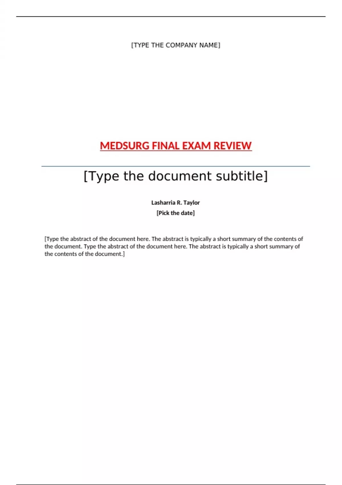 AMERICAN CAREER COLLEGE WEST COAST UNIVERSITY ATI Med-Surg (Multiple Response) [Type the document subtitle] Gregorio Uy [Pick the date] [Type the abstract of the document here. The abstract is typically a short summary of the contents of the document. Type the abstract of the document here. The abstract is typically a short summary of the contents of the document.] ATI Med-Surg (Multiple Response) 1. A nurse is collecting data from a client who has emphysema. Which of the following findings should the nurse expect? (Select all that apply.) 1) Dyspnea 2) Barrel chest 3) Clubbing of the fingers 4) Shallow respirations INCORRECT 5) Bradycardia Answer Rationale: Dyspnea is correct. Dyspnea is experienced by clients who have emphysema due to inadequate oxygen exchange in the lungs. Barrel chest is correct. The lungs of clients who have emphysema lose their elasticity, and the diaphragm becomes permanently flattened by overdistention of the lungs. The muscles of the rib cage also become rigid, and the ribs flare outward. This produces the barrel chest typical of emphysema clients. Clubbing of the fingers is correct. Air is trapped in the lungs due to their lack of elasticity, which decreases oxygenation. Clubbing results from these chronic low blood-oxygen levels. Shallow respirations is correct. Clients who have emphysema lose lung elasticity; consequently, respirations become increasingly shallow and more rapid. Bradycardia is incorrect. The heart rate will increase as the heart tries to compensate for less oxygen being delivered to the tissues. 2. A nurse is caring for a client who has Cushing's syndrome. Which of the following clinical manifestations should the nurse expect to observe? (Select all that apply.) 1) Buffalo hump 2) Purple striations 3) Moon face INCORRECT 4) Tremors INCORRECT 5) Obese extremities Answer Rationale: Buffalo hump is correct. Cushing's syndrome is a disease caused by an increased production of cortisol or by excessive use of corticosteroids. Buffalo hump, a collection of fat between the shoulders, is a common manifestation of Cushing's syndrome.Purple striations is correct. Purple striations on the skin of the abdomen, thighs, and breasts are a common manifestation of Cushing's syndrome. This is due to the collection of body fat in these areas.Moon face is correct. Moon face is a common manifestation of Cushing's syndrome. Clients who have this manifestation present with a round, red, full face.Tremors is incorrect. Tremors are not a common finding of Cushing's syndrome.Obese extremities is incorrect. Clients who have Cushing's syndrome have truncal obesity, a protuberant abdomen, with thin extremities, which is due to an alteration in protein metabolism. 3. A nurse is assisting with the care of a client immediately following a lumbar puncture. Which of the following actions should the nurse take? (Select all that apply.) 1) Encourage fluid intake. 2) Monitor the puncture site for hematoma. INCORRECT 3) Insert a urinary catheter. INCORRECT 4) Elevate the client’s head of bed. INCORRECT 5) Apply a cervical collar to the client. Answer Rationale: Encourage fluid intake is correct. The nurse should encourage fluids, unless contraindicated, to replace the cerebrospinal fluid that was removed during the procedure and reduce the risk for a headache. Monitor the puncture site for a hematoma is correct. The nurse should monitor and report a hematoma at the insertion site because this can indicate bleeding. Insert a urinary catheter is incorrect. There is no indication for a urinary catheter insertion. Elevate the client’s head of bed is incorrect. The client should remain flat in bed for 1 hr or more to reduce the risk for a headache. Apply a cervical collar to the client is incorrect. There is no indication for a cervical collar for this client. 4. A nurse is reinforcing pre-operative teaching for a client who is scheduled for surgery and is to take hydroxyzine preoperatively. Which of the following effects of the medication should the nurse include in the teaching? (Select all that apply.) 1) Decreasing anxiety 2) Controlling emesis INCORRECT 3) Relaxing skeletal muscles INCORRECT 4) Preventing surgical site infections 5) Reducing the amount of narcotics needed for pain relief Answer Rationale: Decreasing anxiety is correct. The nurse should include that hydroxyzine is an effective antianxiety agent and is used to decrease anxiety in surgical clients as well as in persons with moderate anxiety. Controlling emesis is correct. The nurse should include that hydroxyzine is an effective antiemetic and is used to control nausea and vomiting in pre- and postoperative clients. Relaxing skeletal muscles is incorrect. The nurse should recognize benzodiazepines, such as diazepam (Valium), are used to produce skeletal muscle relaxation. Preventing surgical site infections is incorrect. The nurse should instruct the client that antibiotics administered prior to surgery are used to diminish the risk of surgical site infections; hydroxyzine, an antiemetic, does not have any effect on bacteria. Reducing the amount of narcotics needed for pain relief is correct. Hydroxyzine increases the effects of narcotic pain medications. The nurse should instruct the client that when it is used for surgical clients, narcotic requirements may be significantly reduced. 5. A nurse is reinforcing teaching with a client who has type 2 diabetes mellitus. The nurse determines that teaching has been effective when the client identifies which of the following manifestations of hypoglycemia? (Select all that apply.) INCORRECT 1) Polyuria 2) Blurry vision 3) Tachycardia INCORRECT 4) Polydipsia 5) Sweating Answer Rationale: Polyuria is incorrect. Hyperglycemia causes polyuria. Blurry vision is correct. Manifestations of hypoglycemia include blurry vision, tremors, anxiety, irritability, headache, and hypotension. Tachycardia is correct. Manifestations of hypoglycemia include tachycardia, tremors, anxiety, 