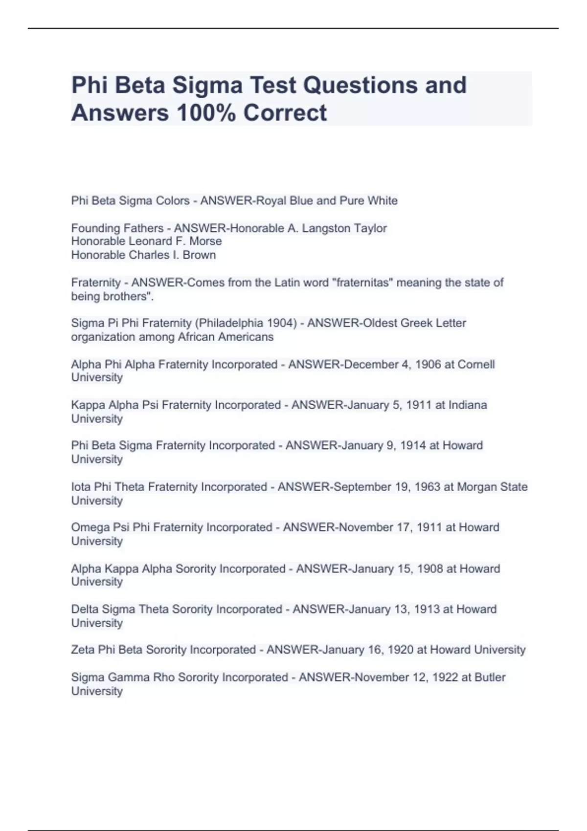 Phi Beta Sigma Test Questions and Answers 100% CorrectPhi Beta Sigma Test Questions and Answers 100% CorrectPhi Beta Sigma Test Questions and Answers 100% CorrectPhi Beta Sigma Test Questions and Answers 100% Correct Phi Beta Sigma Colors - ANSWER-Royal Blue and Pure White Founding Fathers - ANSWER-Honorable A. Langston Taylor Honorable Leonard F. Morse Honorable Charles I. Brown Fraternity - ANSWER-Comes from the Latin word "fraternitas" meaning the state of being brothers". Sigma Pi Phi Fraternity (Philadelphia 1904) - ANSWER-Oldest Greek Letter organization among African Americans Alpha Phi Alpha Fraternity Incorporated - ANSWER-December 4, 1906 at Cornell University