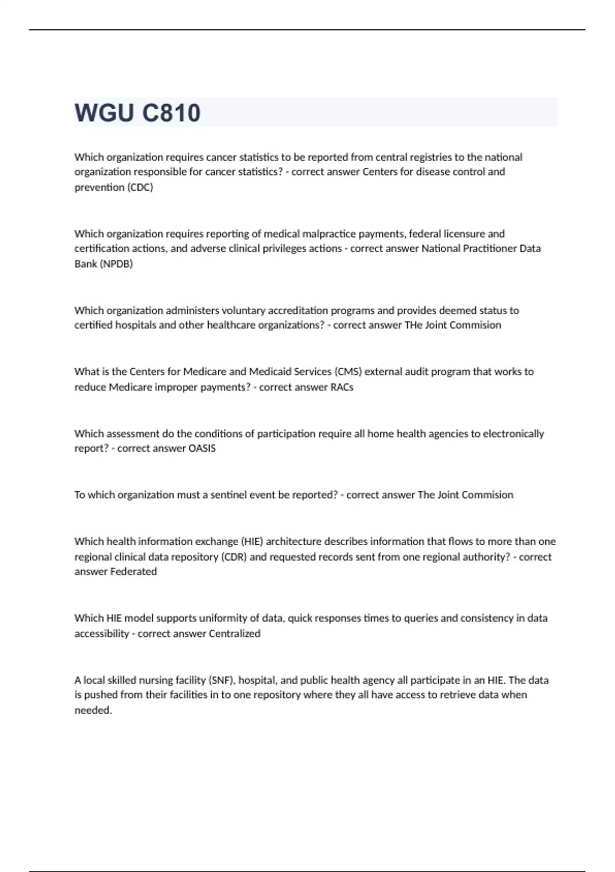 WGU C810Which organization requires cancer statistics to be reported from central registries to the national organization responsible for cancer statistics? - correct answer Centers for disease control and prevention (CDC) Which organization requires reporting of medical malpractice payments, federal licensure and certification actions, and adverse clinical privileges actions - correct answer National Practitioner Data Bank (NPDB) Which organization administers voluntary accreditation programs and provides deemed status to certified hospitals and other healthcare organizations? - correct answer THe Joint Commision What is the Centers for Medicare and Medicaid Services (CMS) external audit program that works to reduce Medicare improper payments? - correct answer RACs Which assessment do the conditions of participation require all home health agencies to electronically report? - correct answer OASIS To which organization must a sentinel event be reported? - correct answer The Joint Commision Which health information exchange (HIE) architecture describes information that flows to more than one regional clinical data repository (CDR) and requested records sent from one regional authority? - correct answer Federated Which HIE model supports uniformity of data, quick responses times to queries and consistency in data accessibility - correct answer Centralized A local skilled nursing facility (SNF), hospital, and public health agency all participate in an HIE. The data is pushed from their facilities in to one repository where they all have access to retrieve data when needed. Which HIE model is used in this scenario? - correct answer Centralized Which characteristic addresses the level of depth represented by data in a fact or dimension table in a data warehouse? - correct answer Granularity Which quality describes data that is unaffected when used across all applications and systems? - correct answer Consistency An HIM analyst is charged with reviewing abstracted information on opioid-related admissions from the hospital's disease index database. The analyst wants to make sure that the correct ICD-10 codes have been abstracted and pulled from the database. Which data quality characteristic does this situation involve? - correct answer Accuracy An HIM director is analyzing the results of a survey that was conducted to ask physicians and nurses about their satisfaction with the HIM department. The following table shows the satisfaction percentage scored for each question 98% How often do HIM staff answer your call within 3 rings? 79% How often are you able to receive the old paper records, on your current patients, in an acceptable timeframe? 100% How often are the reports provided by HIM staff correct and valid? 100% How often do the - correct answer The HIM staff needs additional training on the importance of accessibility of old paper records and needs help in brainstorming a better process. An HIM director is auditing physician documentation and finds that 3% of the discharge summaries from the last 6 months were completed more than 30 days past patient discharge. Which data quality standard is an area of concern in this scenario? - correct answer Timeliness