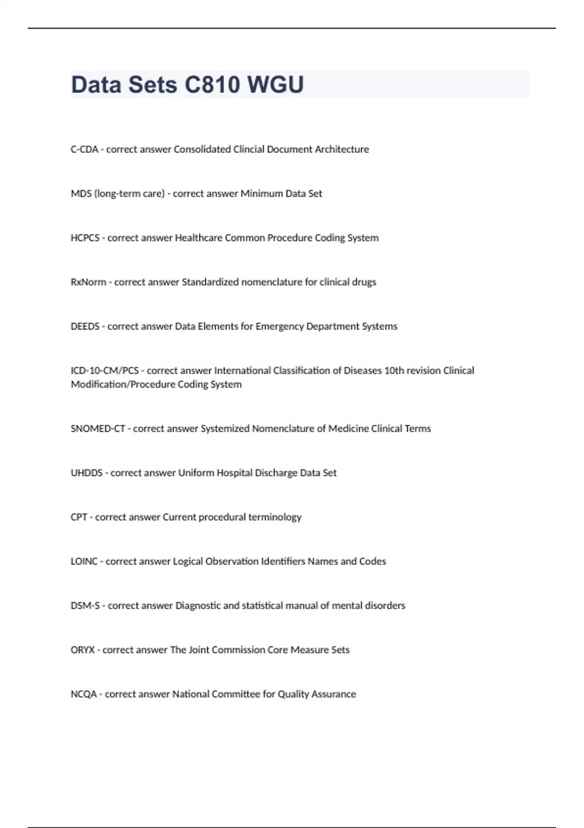 Data Sets C810 WGU C-CDA - correct answer Consolidated Clincial Document Architecture MDS (long-term care) - correct answer Minimum Data Set HCPCS - correct answer Healthcare Common Procedure Coding System RxNorm - correct answer Standardized nomenclature for clinical drugs DEEDS - correct answer Data Elements for Emergency Department Systems ICD-10-CM/PCS - correct answer International Classification of Diseases 10th revision Clinical Modification/Procedure Coding System SNOMED-CT - correct answer Systemized Nomenclature of Medicine Clinical Terms UHDDS - correct answer Uniform Hospital Discharge Data Set CPT - correct answer Current procedural terminology LOINC - correct answer Logical Observation Identifiers Names and Codes DSM-S - correct answer Diagnostic and statistical manual of mental disorders ORYX - correct answer The Joint Commission Core Measure Sets NCQA - correct answer National Committee for Quality Assurance OASIS - correct answer Outcome and Assessment Information Set (for home healthcare) HEDIS - correct answer Healthcare Effectiveness Data and Information Set NQF - correct answer National quality Forum Meaningful use - correct answer EHR incentive program (defined core and menu sets)