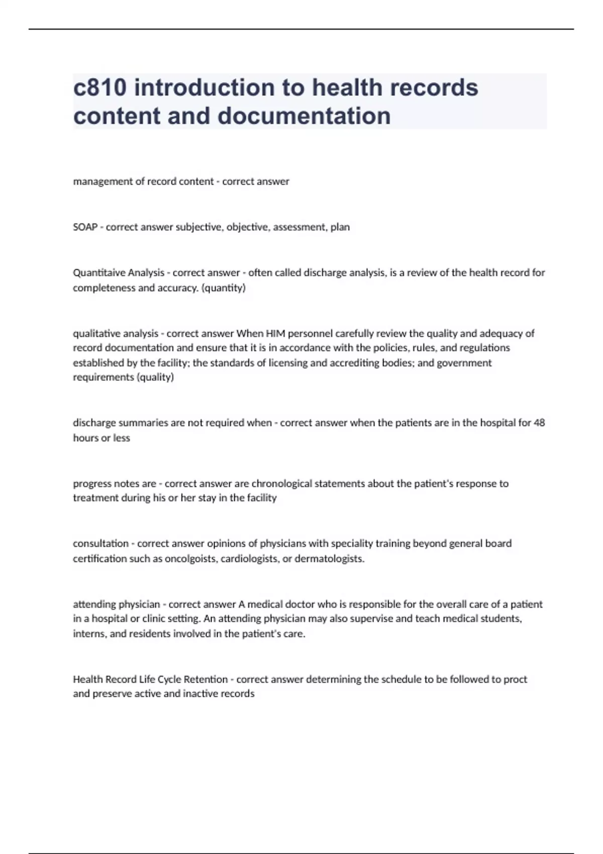 c810 introduction to health records content and documentationmanagement of record content - correct answer SOAP - correct answer subjective, objective, assessment, plan Quantitaive Analysis - correct answer - often called discharge analysis, is a review of the health record for completeness and accuracy. (quantity) qualitative analysis - correct answer When HIM personnel carefully review the quality and adequacy of record documentation and ensure that it is in accordance with the policies, rules, and regulations established by the facility; the standards of licensing and accrediting bodies; and government requirements (quality) discharge summaries are not required when - correct answer when the patients are in the hospital for 48 hours or less progress notes are - correct answer are chronological statements about the patient's response to treatment during his or her stay in the facility consultation - correct answer opinions of physicians with speciality training beyond general board certification such as oncolgoists, cardiologists, or dermatologists. attending physician - correct answer A medical doctor who is responsible for the overall care of a patient in a hospital or clinic setting. An attending physician may also supervise and teach medical students, interns, and residents involved in the patient's care. Health Record Life Cycle Retention - correct answer determining the schedule to be followed to proct and preserve active and inactive records Health Record Life Cycle disposition - correct answer the process of destroying the records once the end of the retention period has been reached overlap - correct answer patient has more than one record in more than one database overlay - correct answer one patient record is overwritten with another record PHI - correct answer Protected Health Information Advanced Directive (AD) - correct answer A legal document in which an individual gives written instructions expressing his or her wishes regarding health care in the event that person can no longer make those decisions. DNR - correct answer do not resuscitate External uses of secondary data - correct answer registries, publich reporting, research, and other purposes MEDLINE - correct answer - Medical Literature, Analysis, and Retrieval System Online- best-known database from National Library of Medicine. HIM professionals use this to locate artivles on HIM issues as well as articles on medical topics MEDPAR - correct answer acute-care hospital and skilled nursing facilities. Claims for all medicare claims NAPHSIS - correct answer National Association for public health statistics and information systems. manages the process of collecting vital statistics NCHS - correct answer national center for health statistics. provides a database of statistical health information to guide public health actions and policymaking