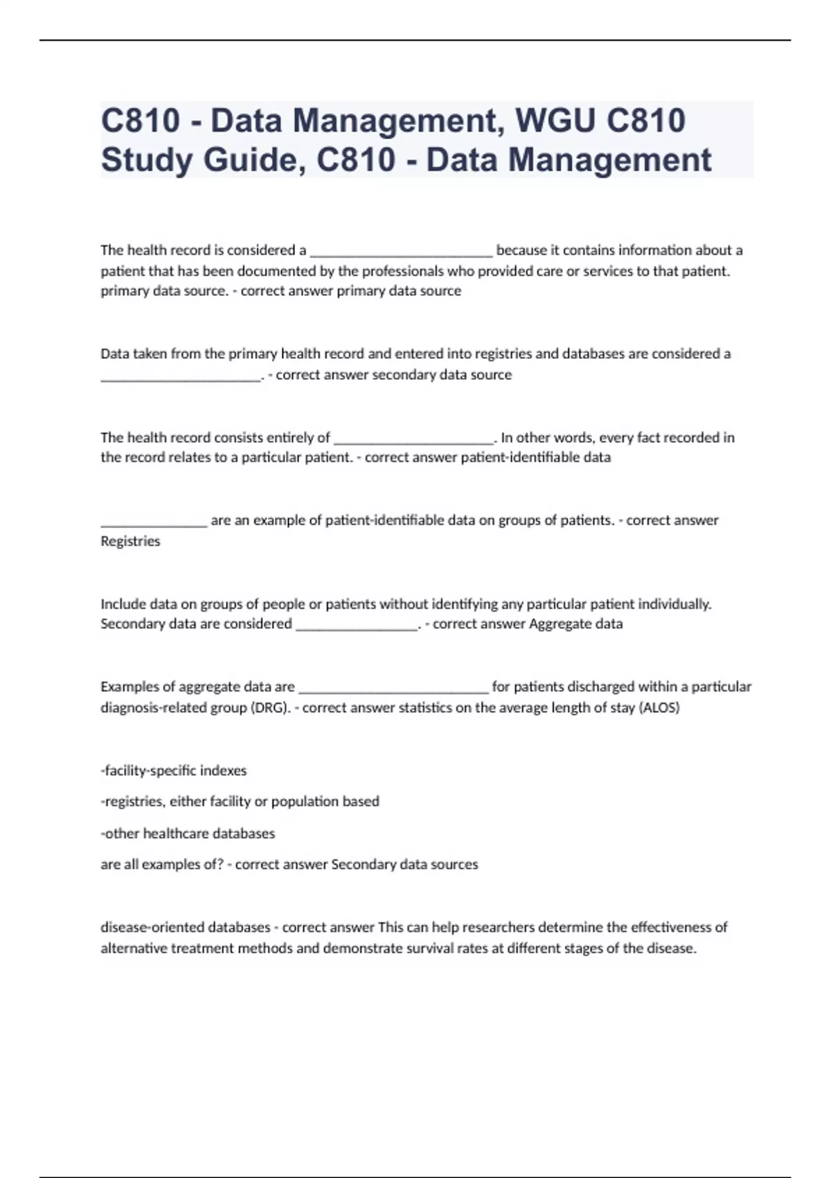 C810 - Data Management, WGU C810 Study Guide, C810 - Data ManagementThe health record is considered a ________________________ because it contains information about a patient that has been documented by the professionals who provided care or services to that patient. primary data source. - correct answer primary data source Data taken from the primary health record and entered into registries and databases are considered a _____________________. - correct answer secondary data source The health record consists entirely of _____________________. In other words, every fact recorded in the record relates to a particular patient. - correct answer patient-identifiable data ______________ are an example of patient-identifiable data on groups of patients. - correct answer Registries Include data on groups of people or patients without identifying any particular patient individually. Secondary data are considered ________________. - correct answer Aggregate data Examples of aggregate data are _________________________ for patients discharged within a particular diagnosis-related group (DRG). - correct answer statistics on the average length of stay (ALOS) -facility-specific indexes -registries, either facility or population based -other healthcare databases are all examples of? - correct answer Secondary data sources disease-oriented databases - correct answer This can help researchers determine the effectiveness of alternative treatment methods and demonstrate survival rates at different stages of the disease. The secondary data provided to external users is generally ______________ and not _________________ data. - correct answer aggregate data and not patient-identifiable The secondary data sources that have been in existence the longest are the ____________ that have been developed within facilities to meet their individual needs. - correct answer indexes The ______________________, which is sometimes called the master person index, contains patient-identifiable data such as name, address, date of birth, dates of hospitalizations or encounters, name of attending physician, and health record number. - correct answer master patient index (MPI) The MPI is an important source of patient health record numbers. These numbers enable the facility to __________________________ for specific patients. - correct answer quickly retrieve health information Most of the information in the MPI is entered into the facility data-base at the time of the _________, _______________, or ___________ process. - correct answer admission, pre-admission, or registration In an acute care setting, the _____________ is a listing in diagnosis code number order for patients discharged from the facility during a particular time period. It is considered patient-identifiable data. - correct answer disease index non-acute settings - correct answer In ________________, the disease index might be generated to reflect patients currently receiving services in the facility. In many cases, facilities no longer have an actual listing for the diagnosis and operation indexes. Instead, they ___________________ utilizing the diagnosis or procedure code needed. - correct answer query the health information system Registries often require more extensive data from the patient record. Each registry must define the cases that are to be included. This process is called ____________________. - correct answer case definition population-based registry - correct answer A registry that gathers information from more than one facility within a geographic area such as a state or region.