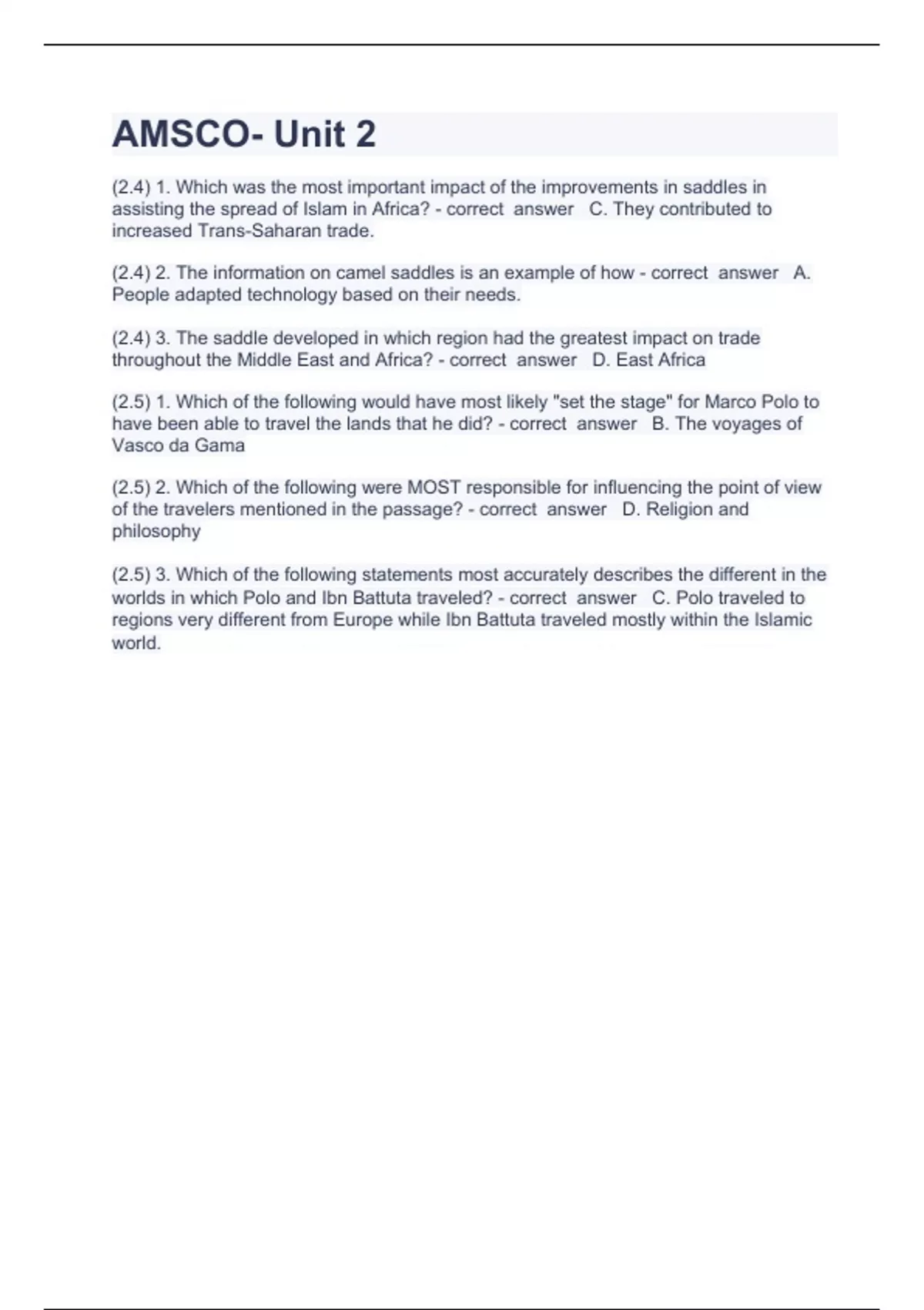 AMSCO Question and(2.4) 1. Which was the most important impact of the improvements in saddles in assisting the spread of Islam in Africa? - correct answer C. They contributed to increased Trans-Saharan trade. (2.4) 2. The information on camel saddles is an example of how - correct answer A. People adapted technology based on their needs. (2.4) 3. The saddle developed in which region had the greatest impact on trade throughout the Middle East and Africa? - correct answer D. East Africa (2.5) 1. Which of the following would have most likely "set the stage" for Marco Polo to have been able to travel the lands that he did? - correct answer B. The voyages of Vasco da Gama (2.5) 2. Which of the following were MOST responsible for influencing the point of view of the travelers mentioned in the passage? - correct answer D. Religion and philosophy (2.5) 3. Which of the following statements most accurately describes the different in the worlds in which Polo and Ibn Battuta traveled? - correct answer C. Polo traveled to regions very different from Europe while Ibn Battuta traveled mostly within the Islamic world. answers correctly solved 2023/2024