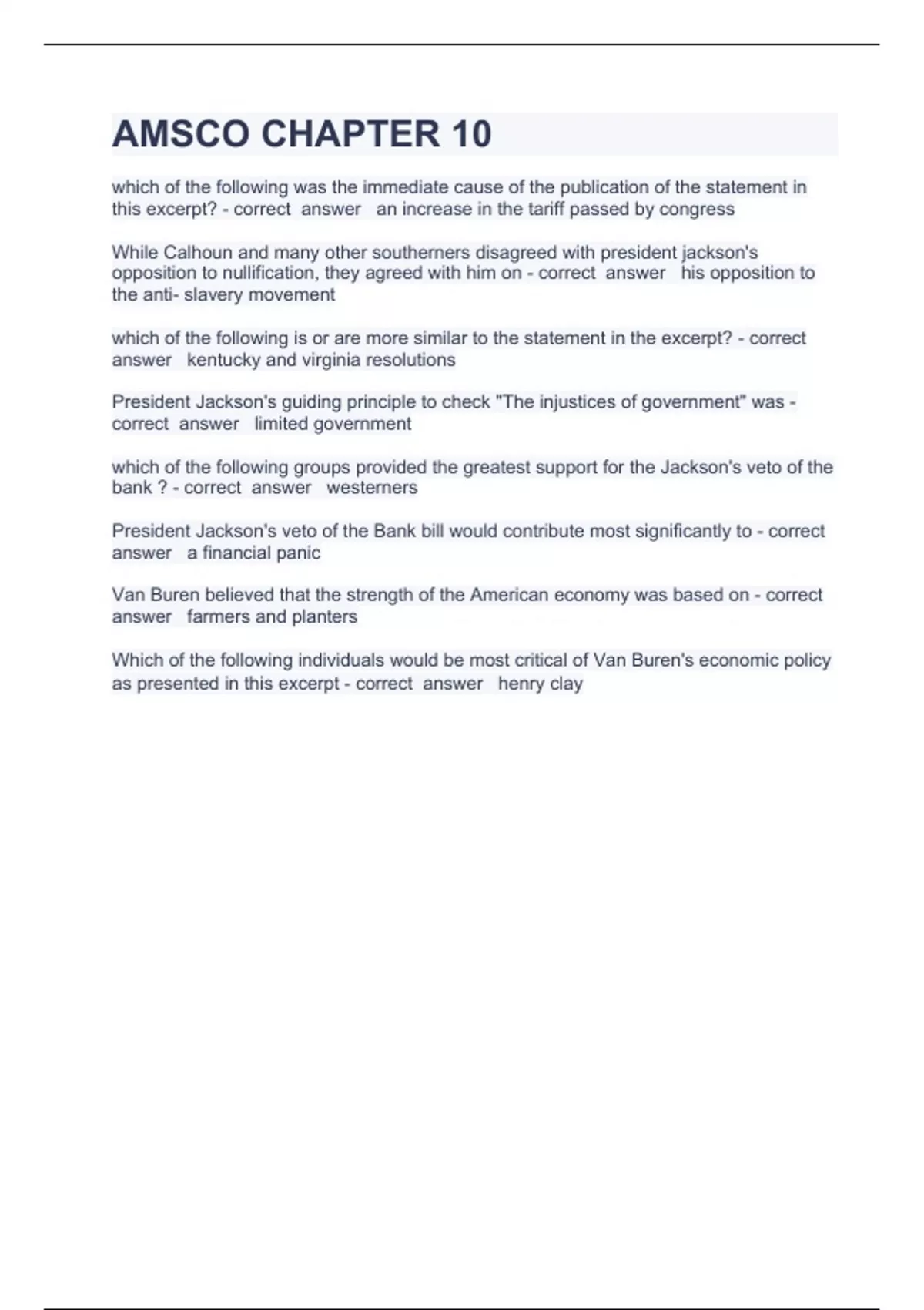 AMSCO CHAPTER 10 Question and answers correctly solved 2023/2024 which of the following was the immediate cause of the publication of the statement in this excerpt? - correct answer an increase in the tariff passed by congress While Calhoun and many other southerners disagreed with president jackson's opposition to nullification, they agreed with him on - correct answer his opposition to the anti- slavery movement which of the following is or are more similar to the statement in the excerpt? - correct answer kentucky and virginia resolutions President Jackson's guiding principle to check "The injustices of government" was - correct answer limited government