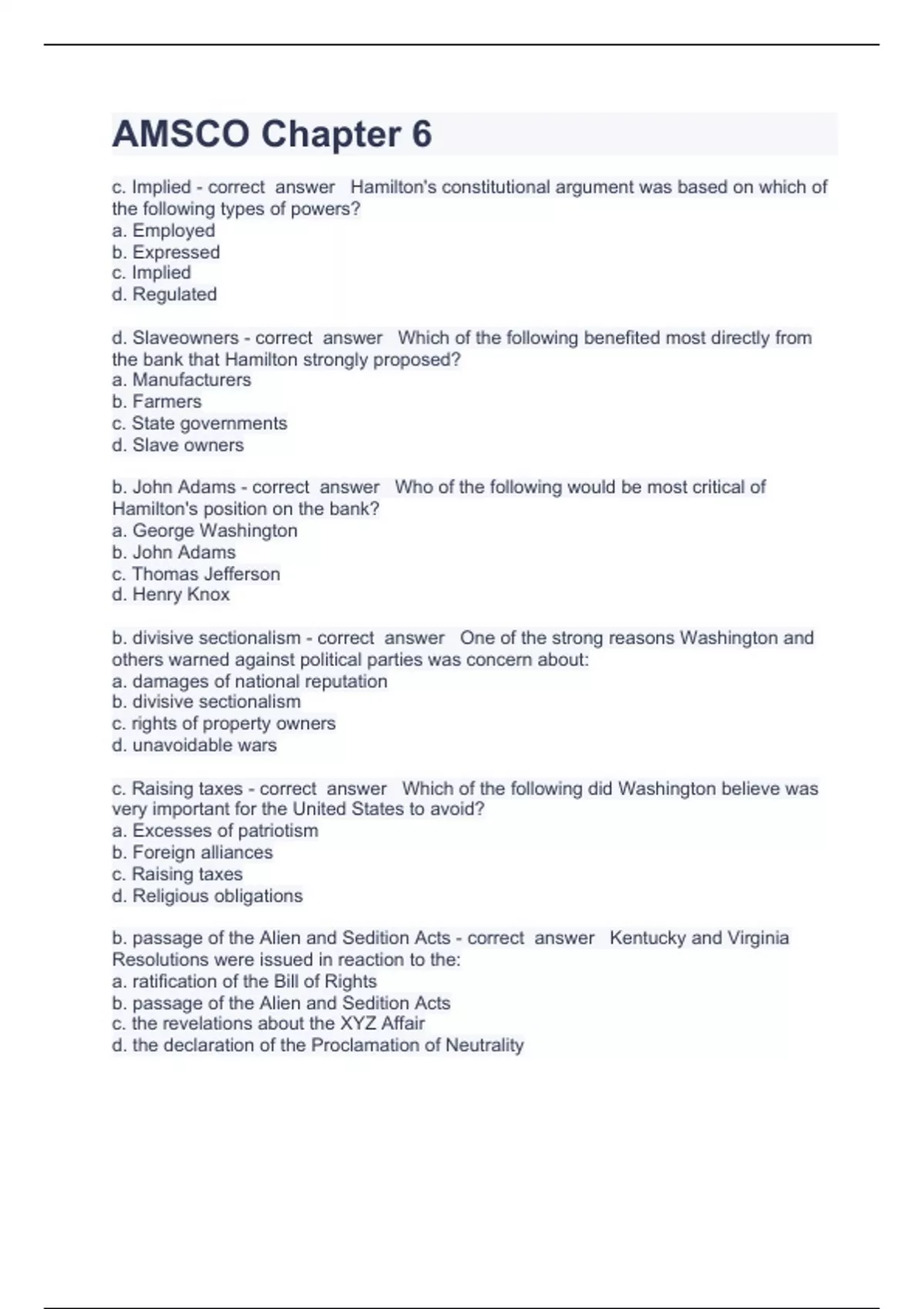 AMSCO Chapter 6 Questionc. Implied - correct answer Hamilton's constitutional argument was based on which of the following types of powers? a. Employed b. Expressed c. Implied d. Regulated d. Slaveowners - correct answer Which of the following benefited most directly from the bank that Hamilton strongly proposed? a. Manufacturers b. Farmers c. State governments d. Slave owners b. John Adams - correct answer Who of the following would be most critical of Hamilton's position on the bank? a. George Washingt and answers already passed 2023/2024