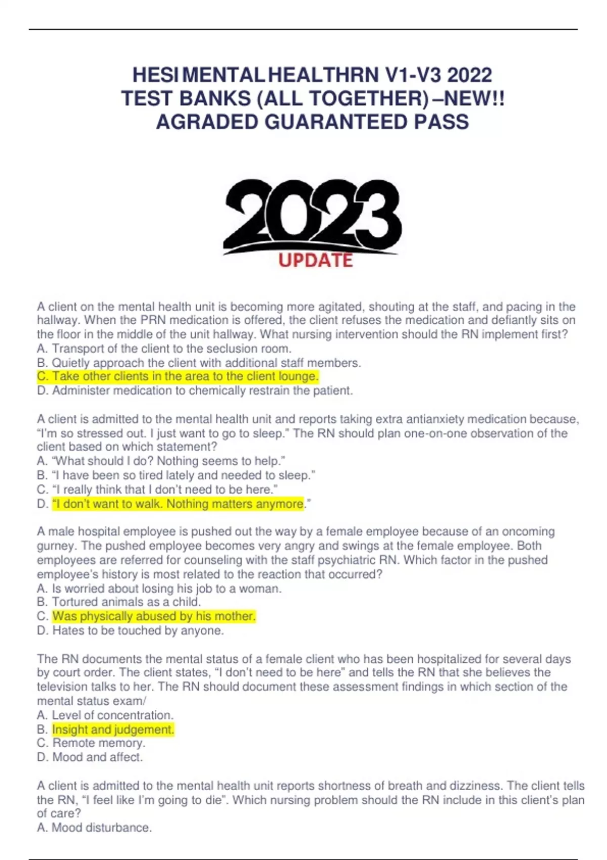 HESIMENTALHEALTHRN V1-V3 2022 TEST BANKS (ALL TOGETHER) –NEW!! AGRADED GUARANTEED PASS A client on the mental health unit is becoming more agitated, shouting at the staff, and pacing in the hallway. When the PRN medication is offered, the client refuses the medication and defiantly sits on the floor in the middle of the unit hallway. What nursing intervention should the RN implement first? A. Transport of the client to the seclusion room. B. Quietly approach the client with additional staff members. C. Take other clients in the area to the client lounge. D. Administer medication to chemically restrain the patient. A client is admitted to the mental health unit and reports taking extra antianxiety medication because, “I’m so stressed out. I just want to go to sleep.” The RN should plan one-on-one observation of the client based on which statement? A. “What should I do? Nothing seems to help.” B. “I have been so tired lately and needed to sleep.” C. “I really think that I don’t need to be here.” D. “I don’t want to walk. Nothing matters anymore