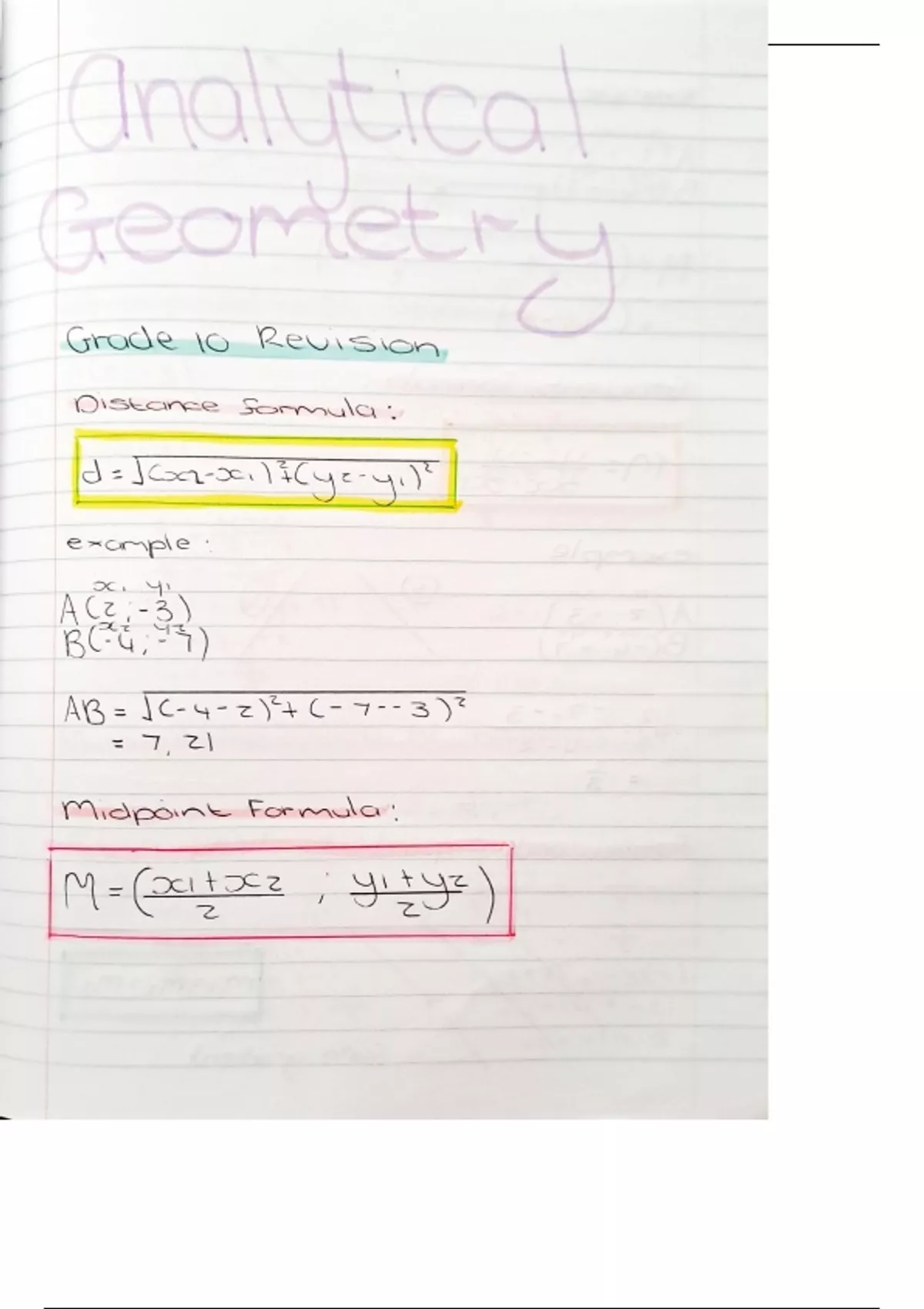 Handwritten notes on grade 11 Analytical Geometry, which contains colourful and a easy to understand guide on all the information you need with practice questions. Math made easy just for you.