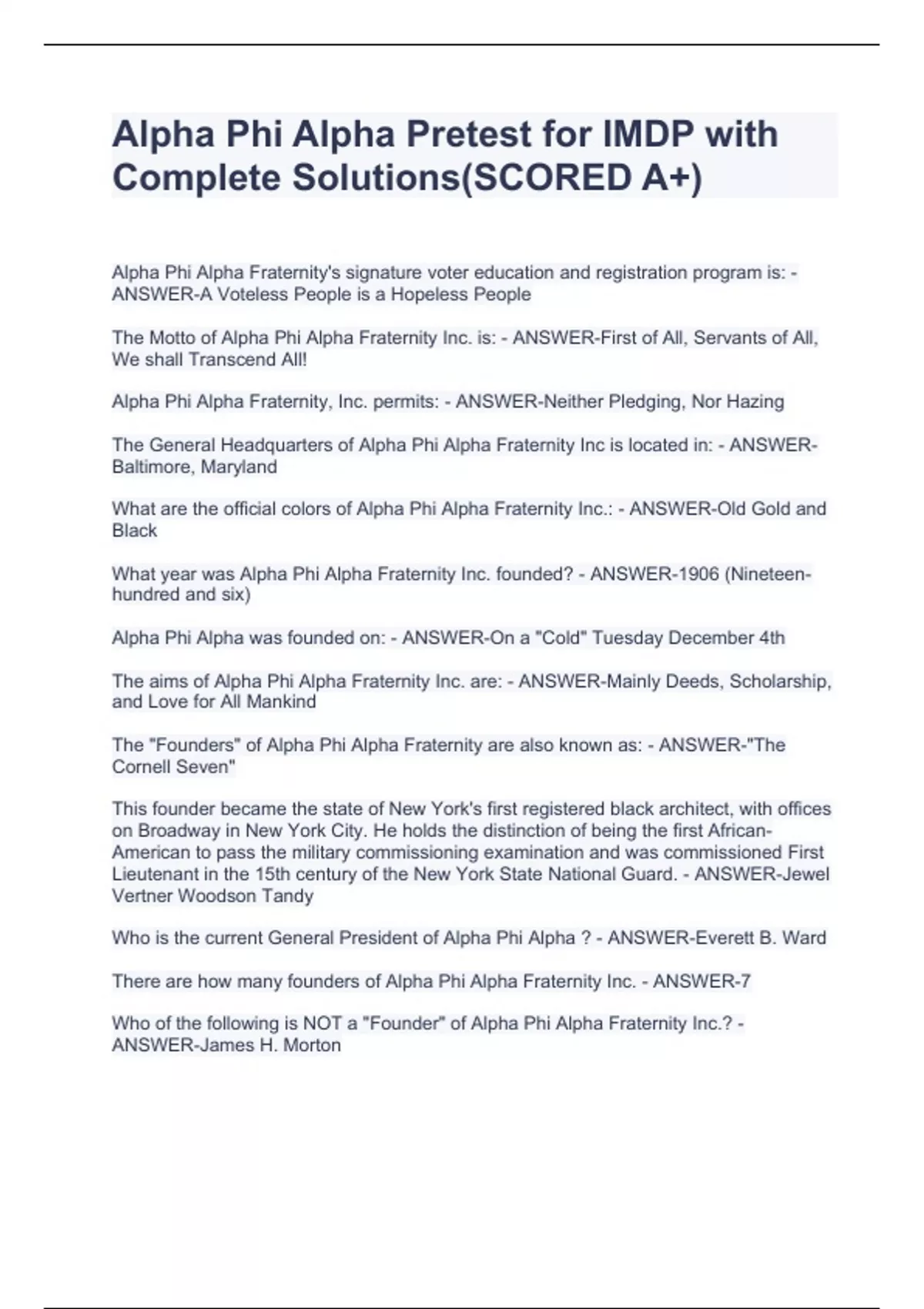 Alpha Phi Alpha Fraternity's signature voter education and registration program is: - ANSWER-A Voteless People is a Hopeless People The Motto of Alpha Phi Alpha Fraternity Inc. is: - ANSWER-First of All, Servants of All, We shall Transcend All! Alpha Phi Alpha Fraternity, Inc. permits: - ANSWER-Neither Pledging, Nor Hazing The General Headquarters of Alpha Phi Alpha Fraternity Inc is located in: - ANSWER-Baltimore, Maryland What are the official colors of Alpha Phi Alpha Fraternity Inc.: - ANSWER-Old Gold and Black What year was Alpha Phi Alpha Fraternity Inc. founded? - ANSWER-1906 (Nineteen-hundred and six) Alpha Phi Alpha Pretest for IMDP with Complete Solutions(SCORED A+)