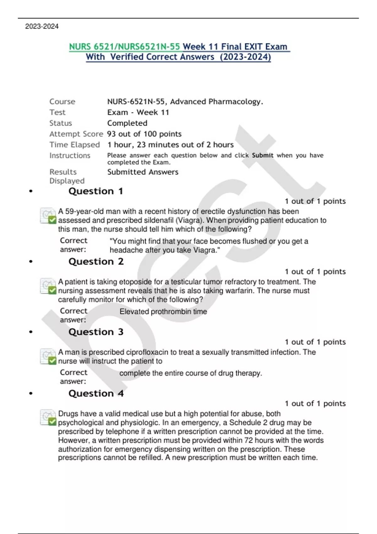 NURS 6521/NURS6521N-55 Week 11 Final EXIT Exam With Verified Correct Answers () A 59-year-old man with a recent history of erectile dysfunction has been assessed and prescribed sildenafil (Viagra). When providing patient education to this man, the nurse should tell him which of the following? Correct answer: "You might find that your face becomes flushed or you get a headache after you take Viagra." • Question 2 1 out of 1 points A patient is taking etoposide for a testicular tumor refractory to treatment. The nursing assessment reveals that he is also taking warfarin. The nurse must carefully monitor for which of the following?