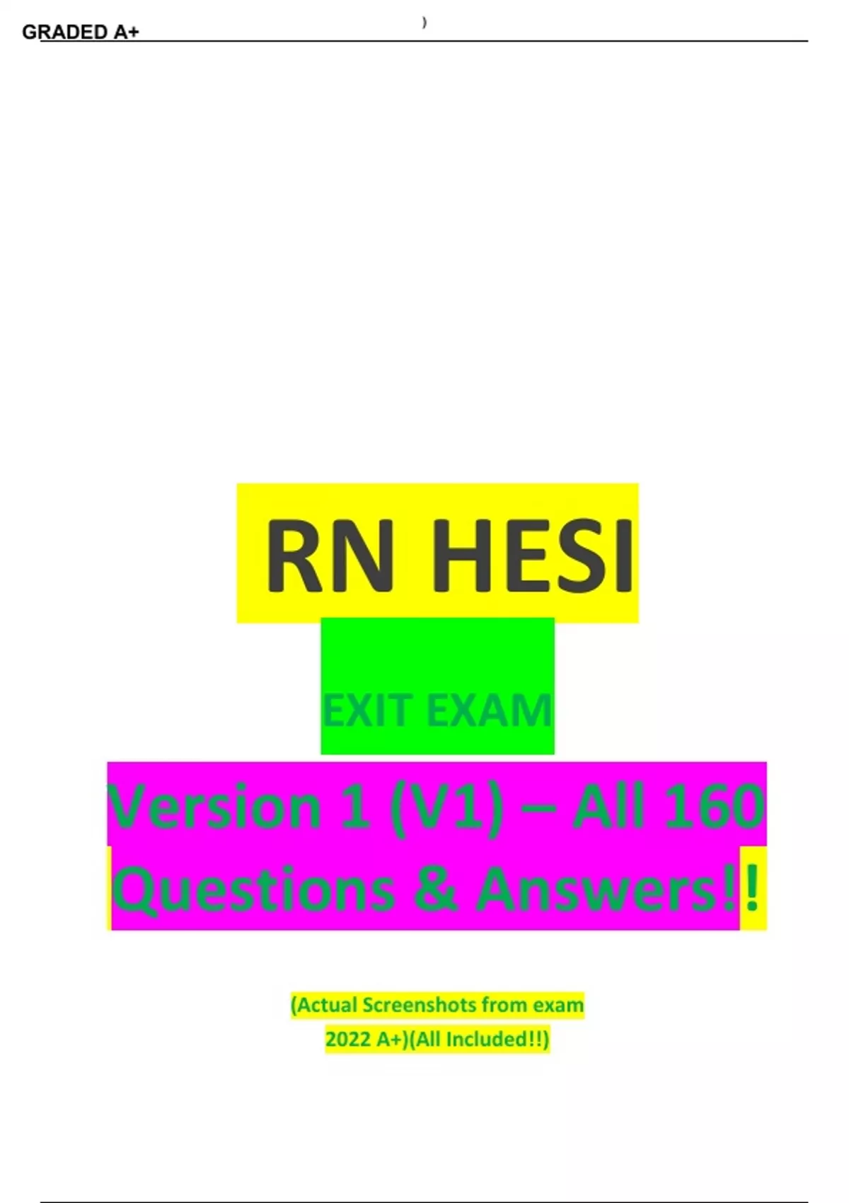 HESI RN EXIT EXAM V1 2023/ HESI RN EXIT ACTUAL EXAM (HESI SCREENSHOTS) (+900 score!) (Recent Exam) (HESI RN EXIT V1 Exam) All 160 Questions and Answers