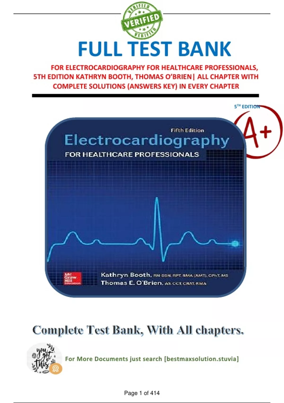 FULL TEST BANK FOR ELECTROCARDIOGRAPHY FOR HEALTHCARE PROFESSIONALS, 5TH EDITION KATHRYN BOOTH, THOMAS O’BRIEN| ALL CHAPTER WITH COMPLETE SOLUTIONS (ANSWERS KEY) IN EVERY CHAPTER