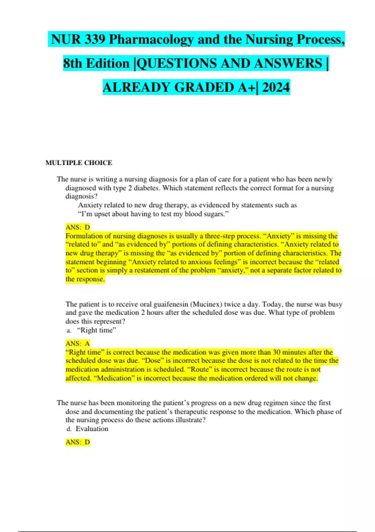 NURS 406 PHARMACOLOGY |QUESTIONSANDANSWERS | ALREADY GRADED A+| 2024