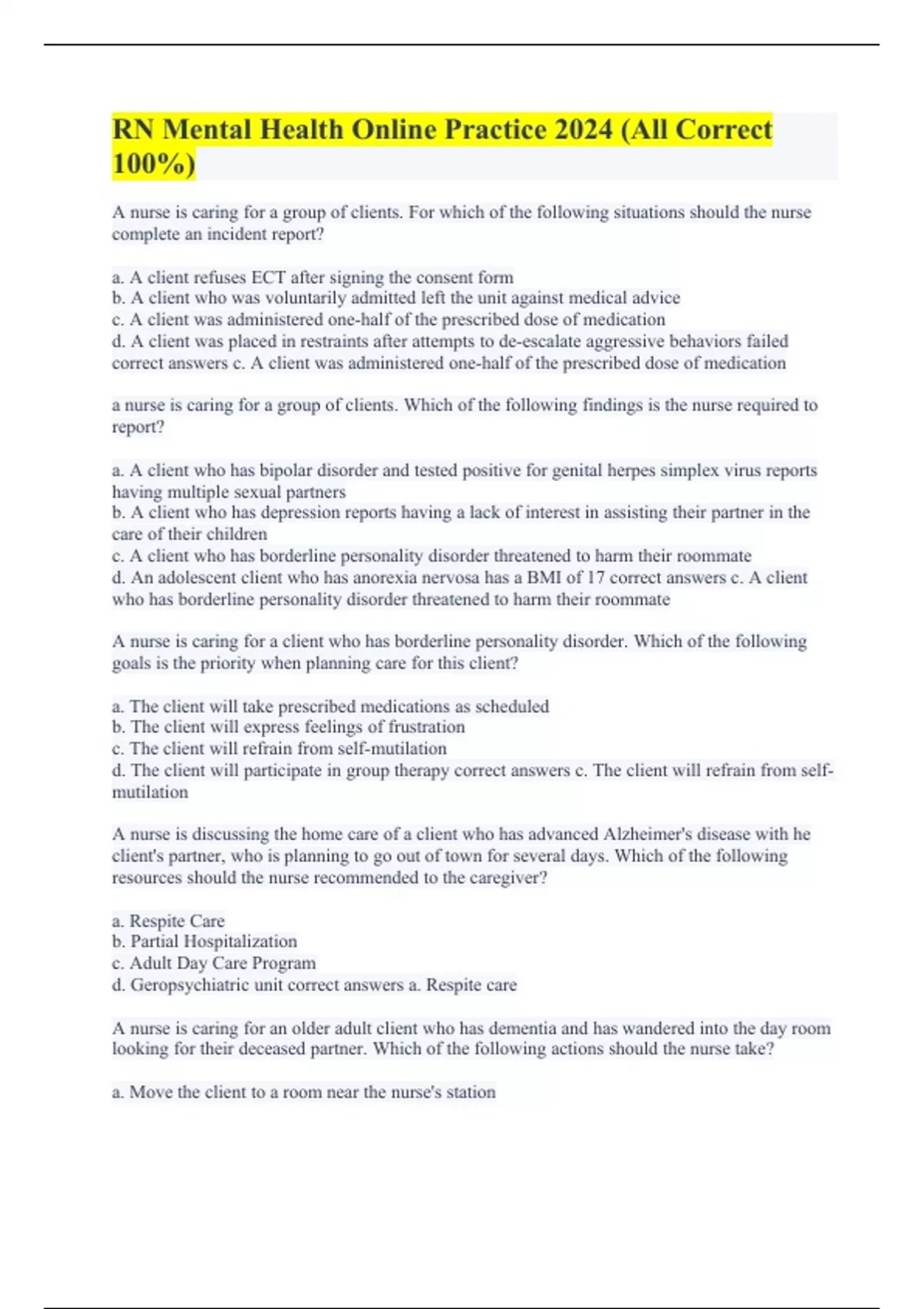 A nurse is caring for a group of clients. For which of the following situations should the nurse complete an incident report? a. A client refuses ECT after signing the consent form b. A client who was voluntarily admitted left the unit against medical advice c. A client was administered one-half of the prescribed dose of medication d. A client was placed in restraints after attempts to de-escalate aggressive behaviors failed correct answers c. A client was administered one-half of the prescribed dose of medication a nurse is caring for a group of clients. Which of the following findings is the nurse required to report? a. A client who has bipolar disorder and tested positive for genital herpes simplex virus reports having multiple sexual partners b. A client who has depression reports having a lack of interest in assisting their partner in the care of their children c. A client who has borderline personality disorder threatened to harm their roommate d. An adolescent client who has anorexia nervosa has a BMI of 17 correct answers c. A client who has borderline personality disorder threatened to harm their roommate A nurse is caring for a client who has borderline personality disorder. Which of the following goals is the priority when planning care for this client? a. The client will take prescribed medications as scheduled b. The client will express feelings of frustration c. The client will refrain from self-mutilation d. The client will participate in group therapy correct answers c. The client will refrain from self-mutilation A nurse is discussing the home care of a client who has advanced Alzheimer's disease with he client's partner, who is planning to go out of town for several days. Which of the following resources should the nurse recommended to the caregiver? a. Respite Care b. Partial Hospitalization c. Adult Day Care Program d. Geropsychiatric unit correct answers a. Respite care A nurse is caring for an older adult client who has dementia and has wandered into the day room looking for their deceased partner. Which of the following actions should the nurse take? a. Move the client to a room near the nurse's station