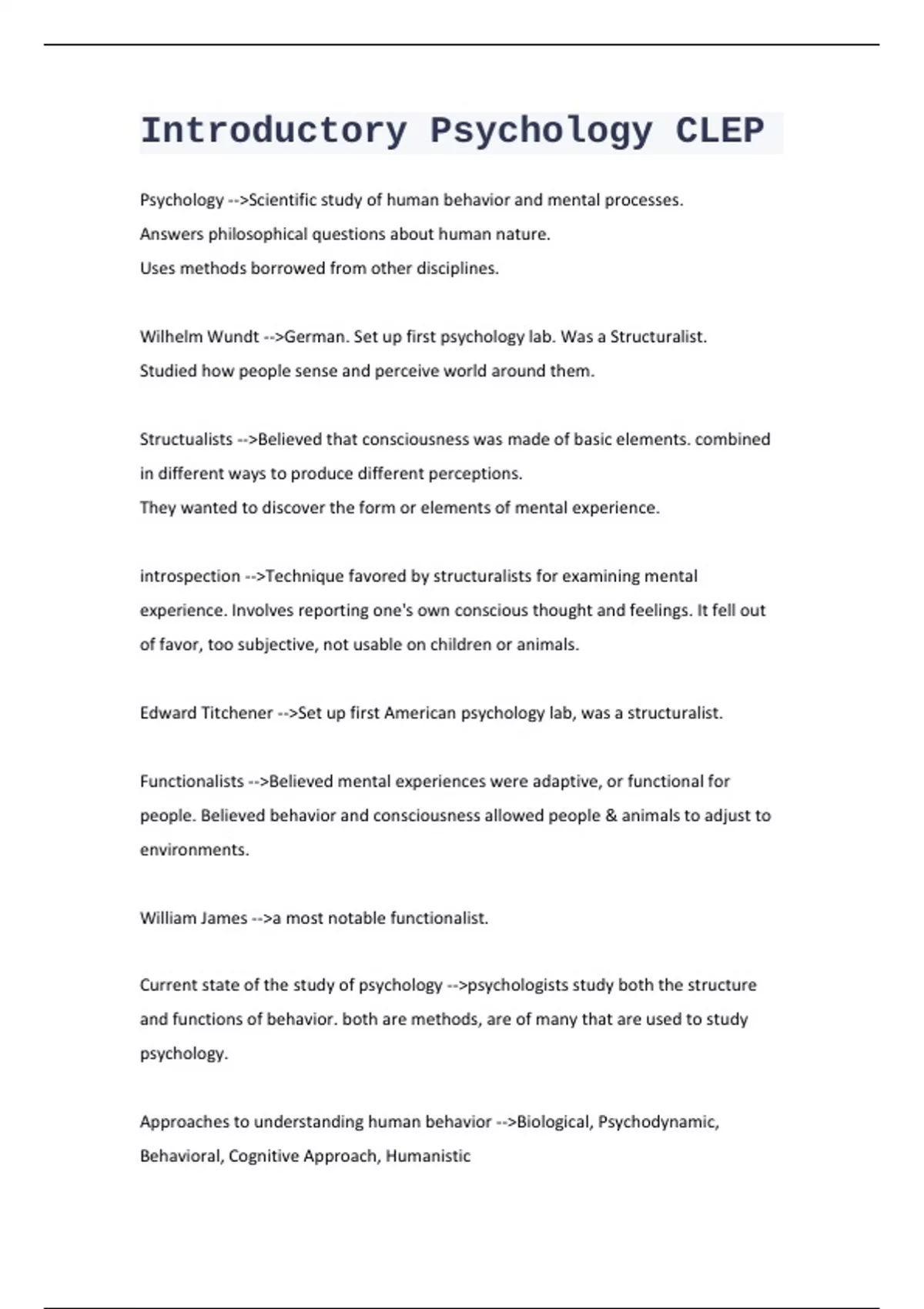 Psychology --Scientific study of human behavior and mental processes. Answers philosophical questions about human nature. Uses methods borrowed from other disciplines. Wilhelm Wundt --German. Set up first psychology lab. Was a Structuralist. Studied how people sense and perceive world around them. Structualists --Believed that consciousness was made of basic elements. combined in different ways to produce different perceptions. They wanted to discover the form or elements of mental experience. introspection --Technique favored by structuralists for examining mental experience. Involves reporting one's own conscious thought and feelings. It fell out of favor, too subjective, not usable on children or animals. Edward Titchener --Set up first American psychology lab, was a structuralist. Functionalists --Believed mental experiences were adaptive, or functional for people. Believed behavior and consciousness allowed people & animals to adjust to environments. William James --a most notable functionalist. Current state of the study of psychology --psychologists study both the structure and functions of behavior. both are methods, are of many that are used to study psychology. Approaches to understanding human behavior --Biological, Psychodynamic, Behavioral, Cognitive Approach, Humanistic Biological approach --Focus on physiological and biochemical processes might produce psychological phenomena. Psychodynamic approach --Thoughts, feelings and behaviors stem from the interaction of innate drives and restrictions on those drives. Most important drives according to Sigmund Freud are that of sexual and aggression. [we have drives]+[society, limitations]=[conflicts] how we approach conflicts determines personality. The reason for much of your behavior are unconscious and rooted in childhood. Behaviorist approach --Explains behavior in terms of learned responses to predictable patterns of environmental stimuli. Pavlov (and his dogs) = classical conditioning Skinner = operant conditioning They study animals in order to understand people more often than the other approaches. They don't believe in expectations, feelings or thoughts. Cognitive approach --reaction against behaviorism. Focuses on explaining behavior in terms of expectations, feelings, and thoughts. Humanistic approach --They believe that people are not machines based on genetic code, stimuli, or calculations, but instead humans have the desire for optimal growth & development (i.e. self-actualization). They believe people are basically good and focus on positive aspects of development. experiments --cause and effect relationships independent variables --The "cause" & always involves treating subjects in at least two different ways experimental group --exposed to cause control group --not exposed to cuase dependent variable --the "effects" of the cause placebo effect --different behavior because the subject knows they are being tested/getting special treatment placebo --fake special treatment blind study --subjects unaware if they are reciving special treatment or not double blind study --both experimenter and experimetee are unaware of who has recivied special treatment correlational studies --assessing the relationship between two variables positive relationship --high score in one variable results in/correlates to a high score in another variable (+1) negative relationship --high score in one variable results in/correlates to low scores in another variable (-1) correlation coefficient --(+/-)1, the higher the absolute value = more correlation, +/- indicates type of relationship, 0 is no relationship surveys --participants fill out questionaries that ask about variables, researchers determine patterns