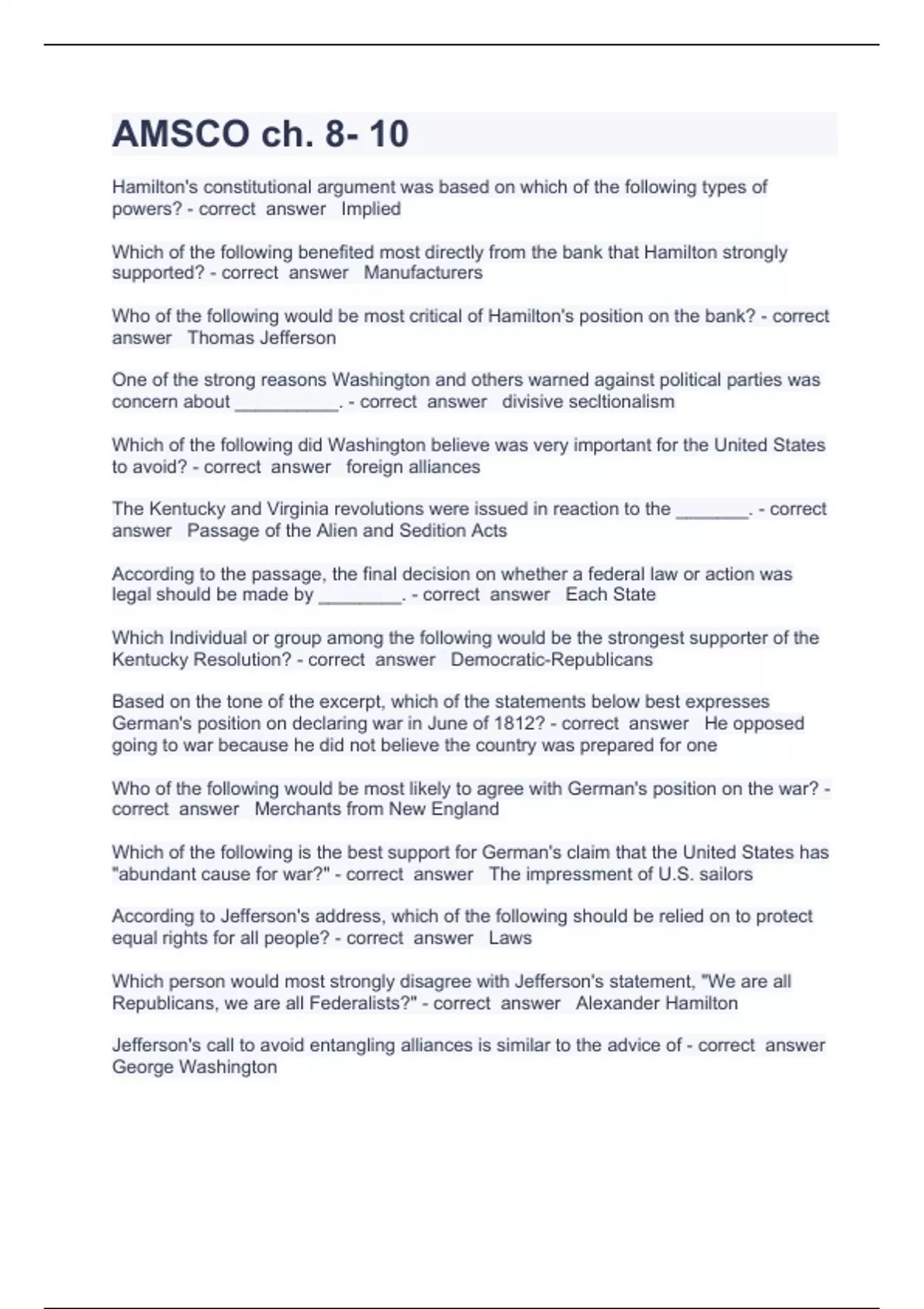 AMSCO ch QueHamilton's constitutional argument was based on which of the following types of powers? - correct answer Implied Which of the following benefited most directly from the bank that Hamilton strongly supported? - correct answer Manufacturers Who of the following would be most critical of Hamilton's position on the bank? - correct answer Thomas Jefferson One of the strong reasons Washington and others warned against political parties was concern about __________. stion and answers 2023/2024 verified to pass