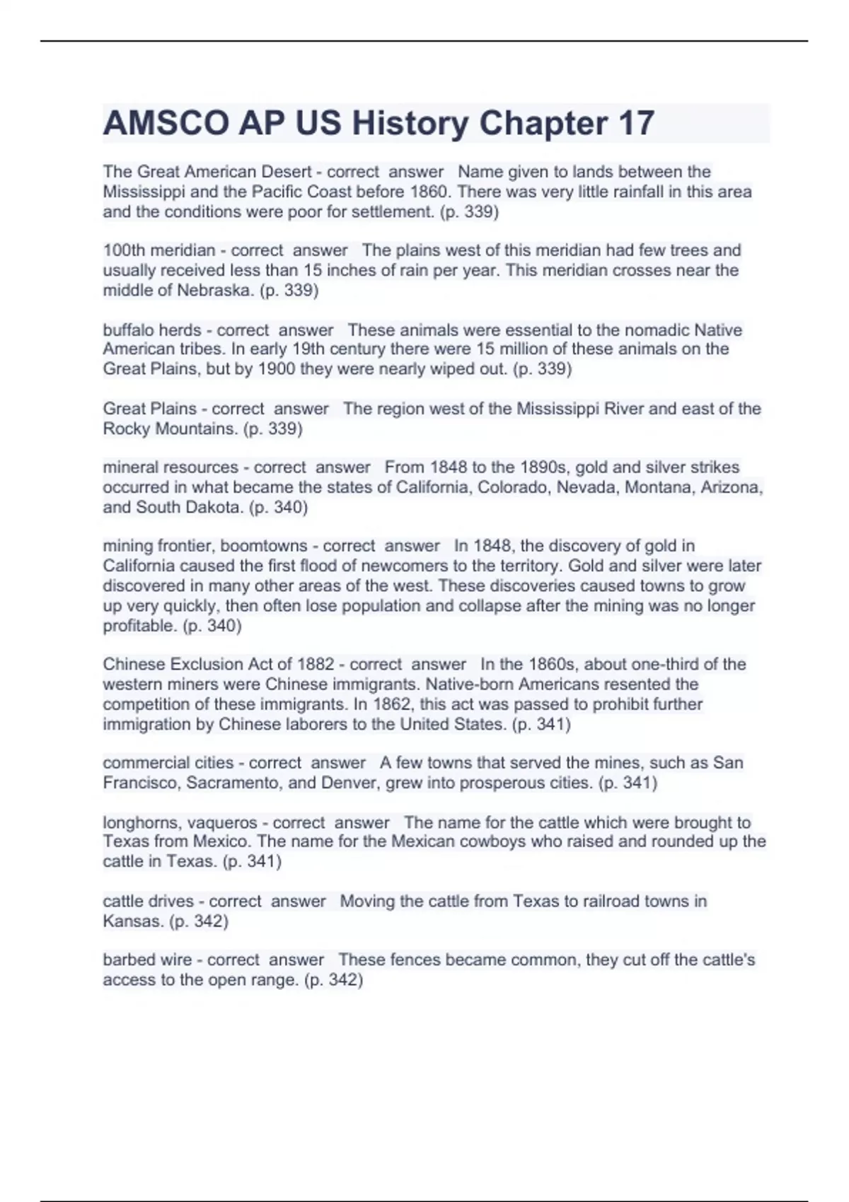 AMSCO AP US History Chapter 17 Question and answers correctly solved 2023/2024The Great American Desert - correct answer Name given to lands between the Mississippi and the Pacific Coast before 1860. There was very little rainfall in this area and the conditions were poor for settlement. (p. 339) 100th meridian - correct answer The plains west of this meridian had few trees and usually received less than 15 inches of rain per year. This meridian crosses near the middle of Nebraska. (p. 339) buffalo herds - correct answer These animals were essential to the nomadic Native American tribes. In early 19th century there were 15 million of these animals on the Great Plains, but by 1900 they were nearly wiped out. (p. 339) Great Plains - correct answer The region west of the Mississippi River and east of the Rocky Mountains