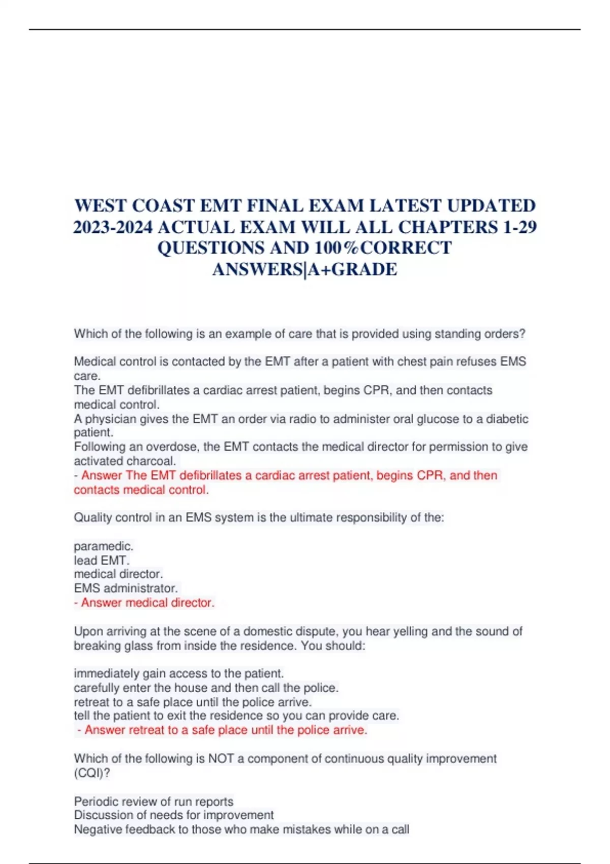 WEST COAST EMT FINAL EXAM LATEST UPDATED ACTUAL EXAM WILL ALL CHAPTERS 1-29 QUESTIONS AND 100%CORRECT ANSWERS|A+GRADE