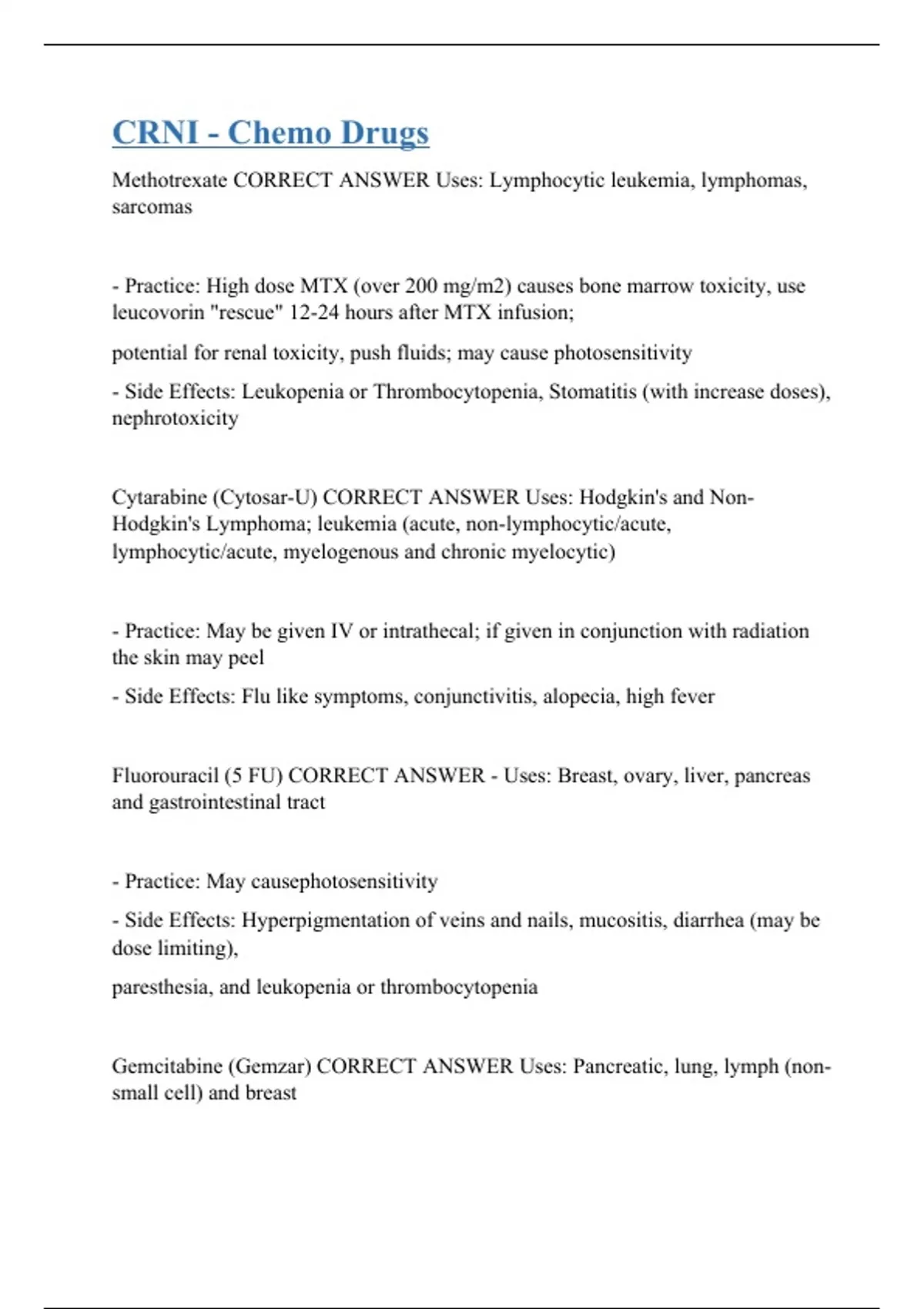 Methotrexate CORRECT ANSWER Uses: Lymphocytic leukemia, lymphomas, sarcomas - Practice: High dose MTX (over 200 mg/m2) causes bone marrow toxicity, use leucovorin "rescue" 12-24 hours after MTX infusion; potential for renal toxicity, push fluids; may cause photosensitivity - Side Effects: Leukopenia or Thrombocytopenia, Stomatitis (with increase doses), nephrotoxicity Cytarabine (Cytosar-U) CORRECT ANSWER Uses: Hodgkin's and Non-Hodgkin's Lymphoma; leukemia (acute, non-lymphocytic/acute, lymphocytic/acute, myelogenous and chronic myelocytic) - Practice: May be given IV or intrathecal; if given in conjunction with radiation the skin may peel - Side Effects: Flu like symptoms, conjunctivitis, alopecia, high fever Fluorouracil (5 FU) CORRECT ANSWER - Uses: Breast, ovary, liver, pancreas and gastrointestinal tract - Practice: May causephotosensitivity - Side Effects: Hyperpigmentation of vei