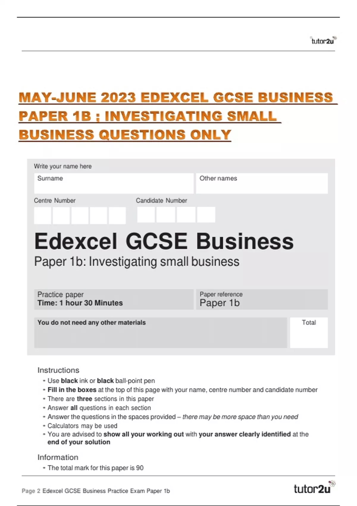 MAY-JUNE 2023 EDEXCEL GCSE BUSINESS PAPER 1B ; INVESTIGATING SMALL BUSINESS QUESTIONS ONLY
