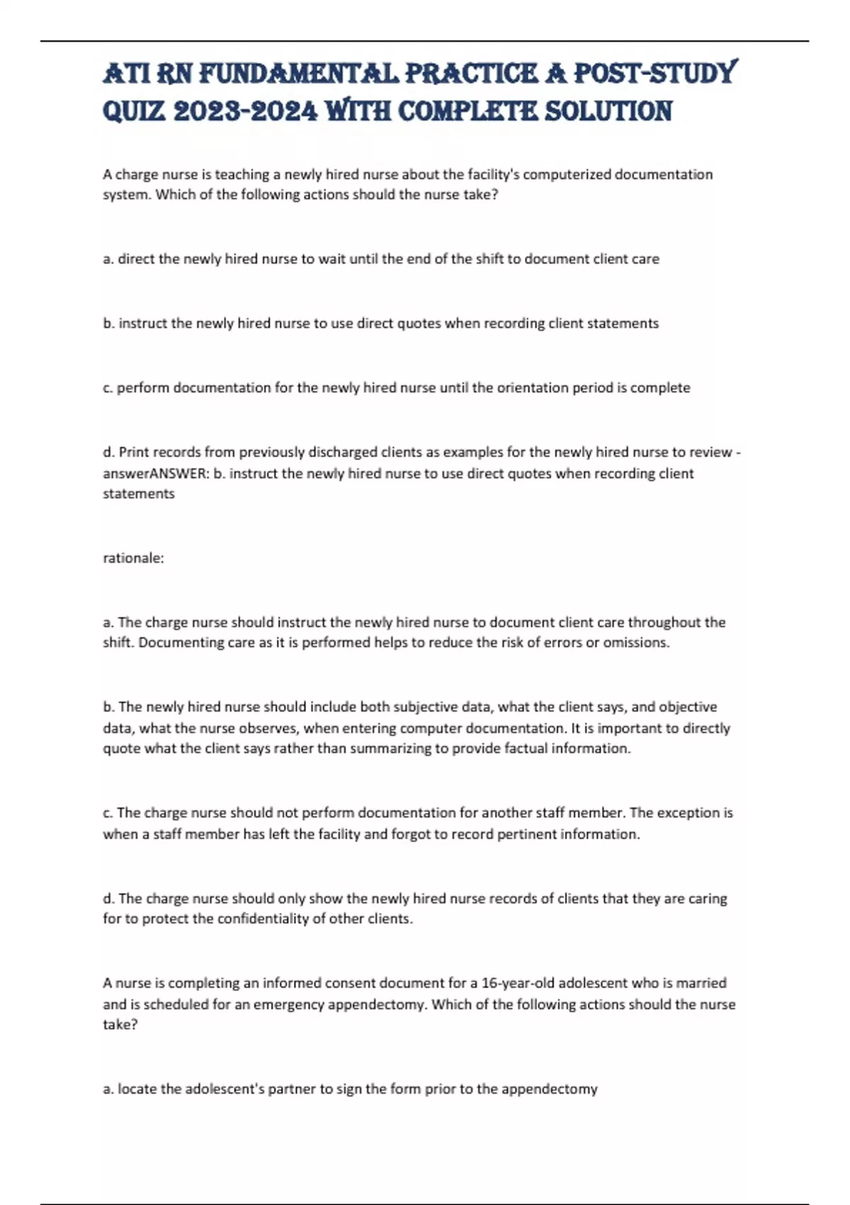 A charge nurse is teaching a newly hired nurse about the facility's computerized documentation system. Which of the following actions should the nurse take? a. direct the newly hired nurse to wait until the end of the shift to document client care b. instruct the newly hired nurse to use direct quotes when recording client statements c. perform documentation for the newly hired nurse until the orientation period is complete d. Print records from previously discharged clients as examples for the newly hired nurse to review - answerANSWER: b. instruct the newly hired nurse to use direct quotes when recording client statements rationale: a. The charge nurse should instruct the newly hired nurse to document client care throughout the shift. Documenting care as it is performed helps to reduce the risk of errors or omissions. b. The newly hired nurse should include both subjective data, what the client says, and objective data, what the nurse observes, when entering computer documentation. It is important to directly quote what the client says rather than summarizing to provide factual information. c. The charge nurse should not perform documentation for another staff member. The exception is when a staff member has left the facility and forgot to record pertinent information. d. The charge nurse should only show the newly hired nurse records of clients that they are caring for to protect the confidentiality of other clients. A nurse is completing an informed consent document for a 16-year-old adolescent who is married and is scheduled for an emergency appendectomy. Which of the following actions should the nurse take? a. locate the adolescent's partner to sign the form prior to the appendectomy ATI RN fundamental practice A post-study quiz with complete solution b. document consent is implied due to the urgency of the procedure c. tell the client that a general consent to treatment covers the surgical procedure d. ask the client if they understand the provider's plan for the appendectomy - answerANSWER: d. ask the client if they understand the provider's plan for the appendectomy rationale: a. The nurse should identify that the client's partner can sign a consent form only if the client is unable or incompetent to do so. b. The nurse should identify that implied consent is used for noninvasive procedures, such as obtaining vital signs, in which the client implies consent by allowing the action to take place. c. The nurse should recognize that a general consent to treatment does not address invasive and high-risk procedures. d. To ensure informed consent, the nurse should ask the client if they understand the planned procedure. In most states, a married adolescent is considered emancipated, and has the legal authority to provide their own consent. A nurse is admitting a client to an acute care facility. Which of the following actions by the nurse promotes client self-determination? a. reviewing the policy on safeguarding personal valuables with the client b. informing the client's family about the regulations for visitation hours c. providing the client with information about end-of-life decision-making ATI RN fundamental practice A post-study quiz with complete solution d. comparing the client's home medications