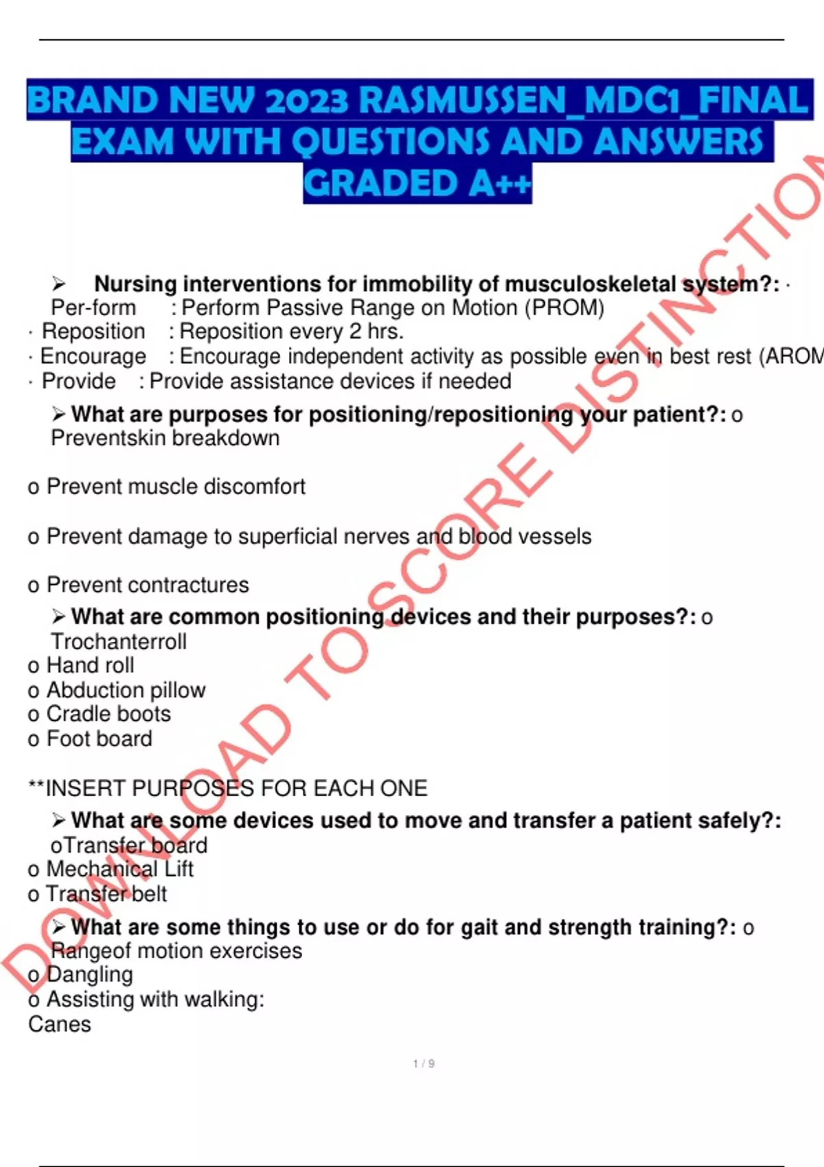 BRAND NEW 2023 RASMUSSEN_MDC1_FINAL EXAM WITH QUESTIONS AND ANSWERS GRADED A++  Nursing interventions for immobility of musculoskeletal system?: · Per-form : Perform Passive Range on Motion (PROM) · Reposition : Reposition every 2 hrs. · Encourage : Encourage independent activity as possible even in best rest (AROM) · Provide : Provide assistance devices if needed What are purposes for positioning/repositioning your patient?: o Preventskin breakdown o Prevent muscle discomfort o Prevent damage to superficial nerves and blood vessels o Prevent contractures What are common positioning devices and their purposes?: o Trochanterroll o Hand roll o Abduction pillow o Cradle boots o Foot board **INSERT PURPOSES FOR EACH ONE What are some devices used to move and transfer a patient safely?: oTransfer board o Mechanical Lift o Transfer belt What are some things to use or do for gait and strength training?: o Rangeof motion exercises o Dangling o Assisting with walking: Canes 2 / 9 Walkers Crutches 3 / 9 Effects of immobility on the respiratory system?: Decrease in the depth ofrespiration Pooling of secretions in the airways Decrease ability to effectively cough Leads to atelectasis Common nursing interventions for a patient whose respiratory system isbeing affected by immobility?: o Turn, Cough and Deep breath every 2 hours o Incentive spirometer every 2 hours while awake o Use chest physiotherapy o Encourage fluid intake of at least 2000 mL per day unless contraindicated o Assess lungs, cough, and sputum production at least every shift Effects of immobility on the circulatory system?: Increases the workloadof the heart Promotes venous stasis Orthostatic hypotension Risk of thrombus formation