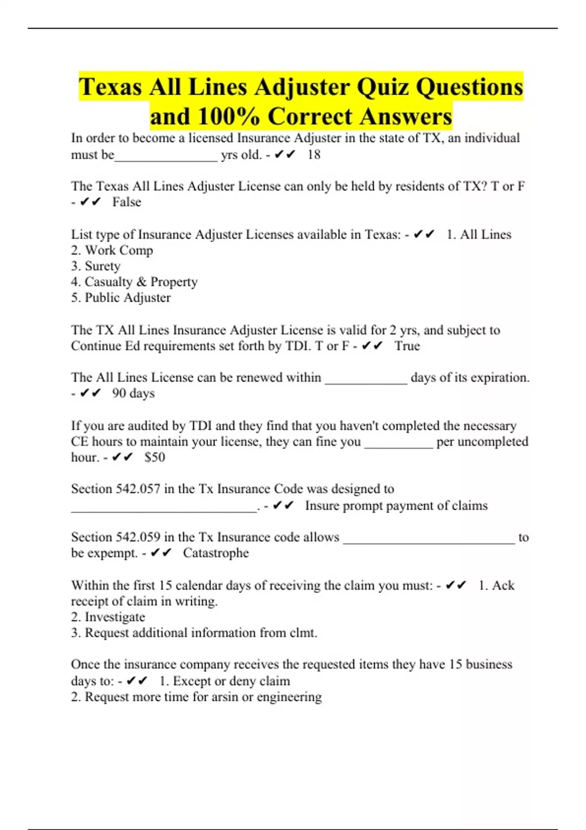 Texas All Lines Adjuster Quiz Questions and 100% Correct Answers