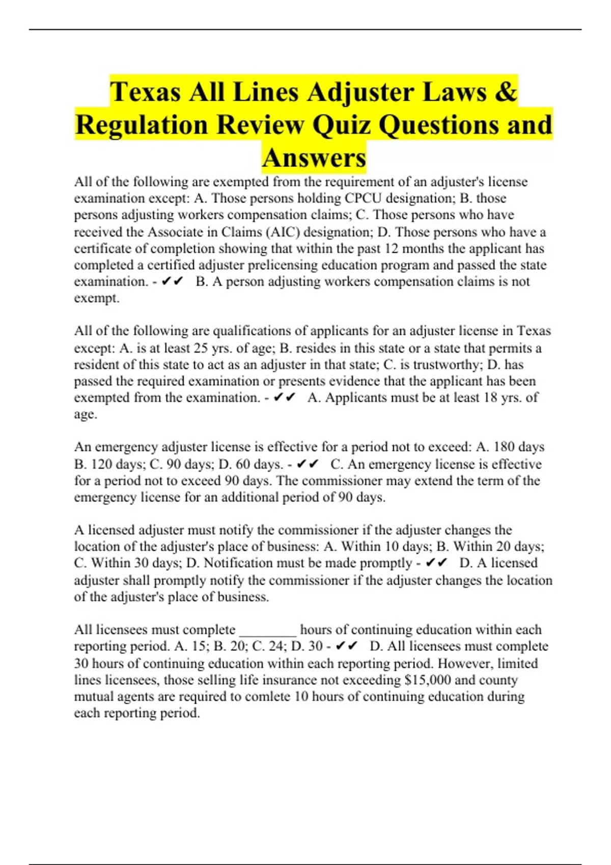 Texas All Lines Adjuster Laws & Regulation Review Quiz Questions and Answers