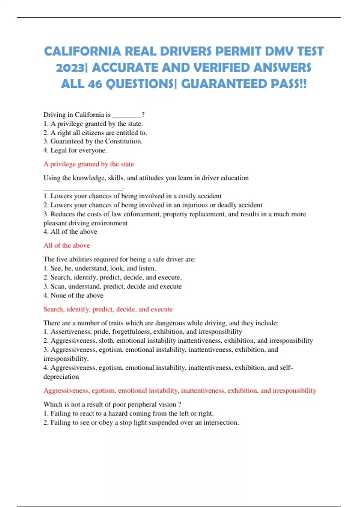 CALIFORNIA REAL DRIVERS PERMIT DMV TEST 2023| ACCURATE AND VERIFIED ANSWERS ALL 46 QUESTIONS| GUARANTEED PASS!!