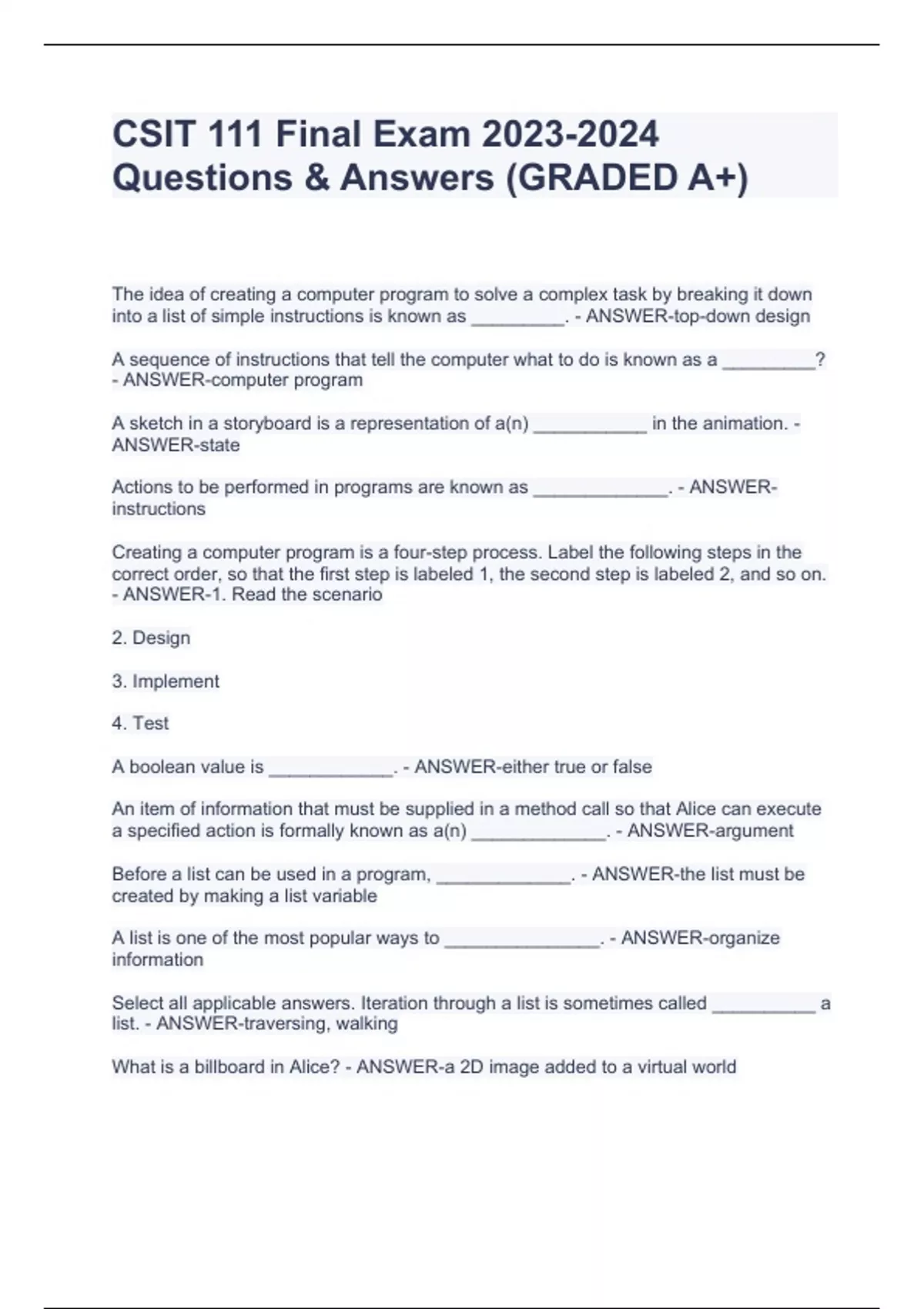 The idea of creating a computer program to solve a complex task by breaking it down into a list of simple instructions is known as _________. - ANSWER-top-down design A sequence of instructions that tell the computer what to do is known as a _________? - ANSWER-computer program A sketch in a storyboard is a representation of a(n) ___________ in the animation. - ANSWER-state Actions to be performed in programs are known as _____________. - ANSWER-instructions Creating a computer program is a four-step process. Label the following steps in the correct order, so that the first step is labeled 1, the second step is labeled 2, and so on. - ANSWER-1. Read the scenario 2. Design 3. Implement 4. Test A boolean value is ____________. - ANSWER-either true or false An item of information that must be supplied in a method call so that Alice can execute a specified action is formally known as a(n) _____________. - ANSWER-argument Before a list can be used in a program, _____________. - ANSWER-the list must be created by making a list variable A list is one of the most popular ways to _______________. - ANSWER-organize information Select all applicable answers. Iteration through a list is sometimes called __________ a list. - ANSWER-traversing, walking What is a billboard in Alice? - ANSWER-a 2D image added to a virtual world