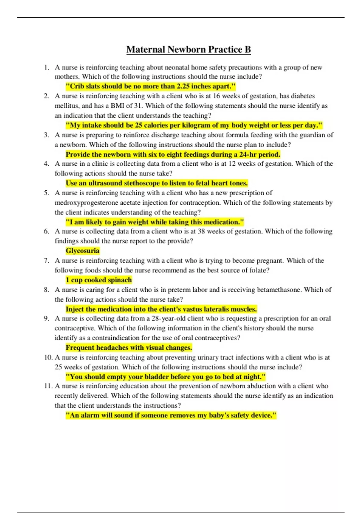 Maternal Newborn Practice B 1. A nurse is reinforcing teaching about neonatal home safety precautions with a group of new mothers. Which of the following instructions should the nurse include? "Crib slats should be no more than 2.25 inches apart." 2. A nurse is reinforcing teaching with a client who is at 16 weeks of gestation, has diabetes mellitus, and has a BMI of 31. Which of the following statements should the nurse identify as an indication that the client understands the teaching? "My intake should be 25 calories per kilogram of my body weight or less per day." 3. A nurse is preparing to reinforce discharge teaching about formula feeding with the guardian of a newborn. Which of the following instructions should the nurse plan to include? Provide the newborn with six to eight feedings during a 24-hr period. 4. A nurse in a clinic is collecting data from a client who is at 12 weeks of gestation. Which of the following actions should the nurse take? Use an ultrasound stethoscope to listen to fetal heart tones.