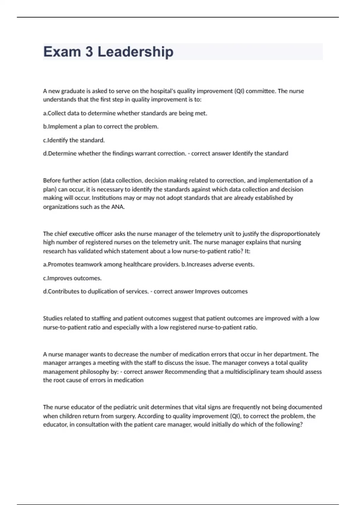 Exam 3 LeadershipA new graduate is asked to serve on the hospital's quality improvement (QI) committee. The nurse understands that the first step in quality improvement is to: a.Collect data to determine whether standards are being met. b.Implement a plan to correct the problem. c.Identify the standard. d.Determine whether the findings warrant correction. - correct answer Identify the standard Before further action (data collection, decision making related to correction, and implementation of a plan) can occur, it is necessary to identify the standards against which data collection and decision making will occur. Institutions may or may not adopt standards that are already established by organizations such as the ANA. The chief executive officer asks the nurse manager of the telemetry unit to justify the disproportionately high number of registered nurses on the telemetry unit. The nurse manager explains that nursing research has validated which statement about a low nurse-to-patient ratio? It: a.Promotes teamwork among healthcare providers. b.Increases adverse events. c.Improves outcomes. d.Contributes to duplication of services. - correct answer Improves outcomes Studies related to staffing and patient outcomes suggest that patient outcomes are improved with a low nurse-to-patient ratio and especially with a low registered nurse-to-patient ratio. A nurse manager wants to decrease the number of medication errors that occur in her department. The manager arranges a meeting with the staff to discuss the issue. The manager conveys a total quality management philosophy by: - correct answer Recommending that a multidisciplinary team should assess the root cause of errors in medication The nurse educator of the pediatric unit determines that vital signs are frequently not being documented when children return from surgery. According to quality improvement (QI), to correct the problem, the educator, in consultation with the patient care manager, would initially do which of the following? a.Talk to the staff individually to determine why this is occurring. b.Call a meeting of all staff to discuss this issue. c.Have a group of staff nurses review the established standards of car - correct answer Call a meeting of all staff to discuss this issue Leadership must identify safety shortcomings and must locate resources at patient care levels to identify and reduce risks. One method of doing this is to invite all staff into a discussion related to solutions to an identified concern. This approach encourages teamwork. A nurse is explaining the pediatric unit's quality improvement (QI) program to a newly employed nurse. Which of the following would the nurse include as the primary purpose of QI programs? a.Evaluation of staff members' performances b.Determination of the appropriateness of standards c.Improvement in patient outcomes d.Preparation for accreditation of the organization by the Joint Commission on Accreditation of Healthcare Organizations (JCAHO) - correct answer Improvement in patient outcomes The primary purpose of QI is improvement of patient outcomes, which relates to prevention of error, quality patient care, and patient satisfaction. The nurse gives an inaccurate dose of medication to a patient. After assessment of the patient, the nurse completes an incident report. The nurse notifies the nursing supervisor of the medication error and calls the physician to report the occurrence. The nurse who administered the inaccurate medication understands that: a.The error will result in suspension. b.An incident report is optional for an event that does not result in injury. c.The error will be documented in her personnel file. d.Risk - correct answer Risk management programs are not designed to assign blame QM stresses improving the system, and the detection of staff errors is not stressed. If errors occur, reeducation of staff is emphasized rather than imposition of punitive measures such as disciplinary action or blaming.