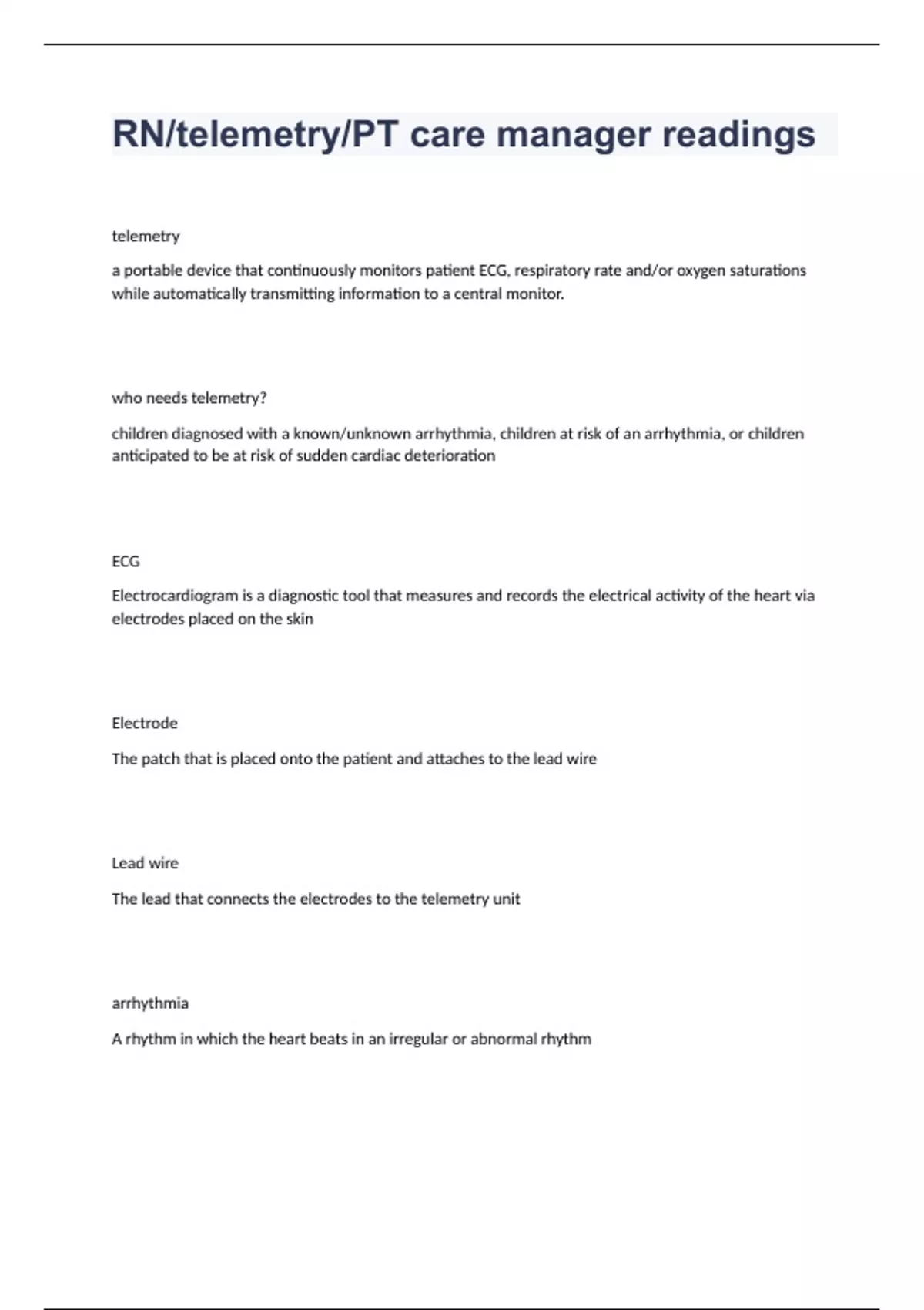 RN/telemetry/PT care manager readings telemetry a portable device that continuously monitors patient ECG, respiratory rate and/or oxygen saturations while automatically transmitting information to a central monitor. who needs telemetry? children diagnosed with a known/unknown arrhythmia, children at risk of an arrhythmia, or children anticipated to be at risk of sudden cardiac deterioration ECG Electrocardiogram is a diagnostic tool that measures and records the electrical activity of the heart via electrodes placed on the skin Electrode The patch that is placed onto the patient and attaches to the lead wire Lead wire The lead that connects the electrodes to the telemetry unit arrhythmia A rhythm in which the heart beats in an irregular or abnormal rhythm external pacing Temporary means of pacing a patient's heart telemetry is used to -watch the pattern of your heartbeats -find any heart problems you may have with your heartbeat -see how well your medications are working purpose of wires pick up electrical signals from your heart and send the signals to the telemetry unit what does the telemetry monitor do -changes the signals into pictures of each heartbeat -collects information about your heart continuously