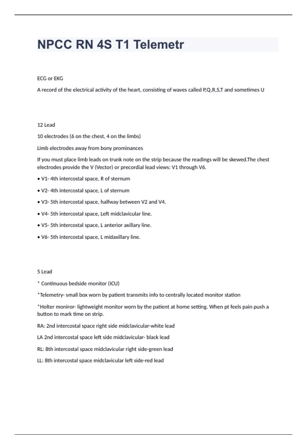 NPCC RN 4S T1 TelemetryECG or EKG A record of the electrical activity of the heart, consisting of waves called P,Q,R,S,T and sometimes U 12 Lead 10 electrodes (6 on the chest, 4 on the limbs) Limb electrodes away from bony prominances If you must place limb leads on trunk note on the strip because the readings will be skewed.The chest electrodes provide the V (Vector) or precordial lead views: V1 through V6. • V1- 4th intercostal space, R of sternum • V2- 4th intercostal space, L of sternum • V3- 5th intercostal space, halfway between V2 and V4. • V4- 5th intercostal space, Left midclavicular line. • V5- 5th intercostal space, L anterior axillary line. • V6- 5th intercostal space, L midaxillary line. 5 Lead * Continuous bedside monitor (ICU) *Telemetry- small box worn by patient transmits info to centrally located monitor station *Holter moniror- lightweight monitor worn by the patient at home setting. When pt feels pain push a button to mark time on strip. RA: 2nd intercostal space right side midclavicular-white lead LA 2nd intercostal space left side midclavicular- black lead RL: 8th intercostal space midclavicular right side-green lead LL: 8th intercostal space midclavicular left side-red lead Chest: 4th intercostal space right side of sternum-brown lead Lead Selection * V1 is the best lead to view ventricular activity and diggerentiate between right and left bundlw branch blocks. * Only 12 Lead and 5 Lead have V1 view 3 Lead Most common but not the optimal monitoring option EASI Lead EASI is a method of continuous electrocardiogram (ECG) monitoring that is an alternative to both the commonly used 5-electrode lead bedside monitoring system and the traditional 10-electrode Mason-Likar 12-lead ECG system. The EASI lead configuration enables continuous 12 lead ECG ambulatory monitoring using only 5 electrodes. The EASI 12-lead ECG is derived from a set of 5 leads; 4 recording electrodes and one grounding electrode. The placement of these leads is as follows [4]. E: Lower extreme of the sternum A: Left mid-axillary line, same transverse line as E S: Sternal manubrium I: Right mid-axillary line, same transverse line as E G: Fifth electrode is the ground and can be placed anywhere on the torso Trouble Shooting and Tips Change the electrodes everyday if loose. Make sure all electrical patient care equipment is grounded. Be sure all the lead cables are intact. Some manufacturers require changing the cables periodically. Be sure the patient's skin is clean and dry. Make sure the leads are connected tightly to the electrodes. Patient movement frequently causes interference. For example, the action of brushing teeth may cause interference that mimics V-Tach. Change the electrodes everyday if loose. Make sure all electrical patient care equipment is grounded. Be sure all the lead cables are intact. Some manufacturers require changing the cables periodically. Be sure the patient's skin is clean and dry. Make sure the leads are connected tightly to the electrodes. Patient movement frequently causes interference. For example, the action of brushing teeth may cause interference that mimics V-Tach. Change the electrodes everyday if loose. Make sure all electrical patient care equipment is grounded. Be sure all the lead cables are intact. Some manufacturers require changing the cables periodically. Be sure the patient's skin is clean and dry. Make sure the leads are connected tightly to the electrodes. Patient movement frequently causes interference. For example, the action of brushing teeth may cause interference that mimics V-Tach. Telemetry Strip An ECG complex represents the electrical events occurring in one cardiac cycle. A complex consists of 5 waveforms labeled with the letters P,Q,R,S, and T, and sometimes a U wave. The middle 3 letters, QRS are referred to as a unit, the QRS complex. P wave represents atrial depolarization QRS represents ventricular depolarization