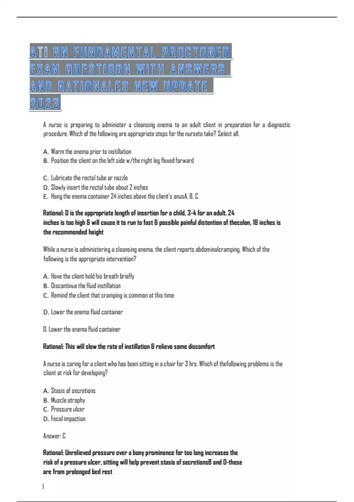 ATI RN FUNDAMENTAL PROCTORED EXAM QUESTION WITH ANSWERS AND RATIONALES NEW UPDATE 2023 A nurse is preparing to administer a cleansing enema to an adult client in preparation for a diagnostic procedure. Which of the following are appropriate steps for the nurse to take? Select all. A. Warm the enema prior to instillation B. Position the client on the left side w/the right leg flexed forward C. Lubricate the rectal tube or nozzle D. Slowly insert the rectal tube about 2 inches E. Hang the enema container 24 inches above the client's anus A, B, C Rational: D is the appropriate length of insertion for a child, 3-4 for an adult. 24 inches is too high & will cause it to run to fast & possible painful distention of the colon, 18 inches is the recommended height While a nurse is administering a cleansing enema, the client reports abdominal cramping. Which of the following is the appropriate intervention? A. Have the client hold his breath briefly B. Discontinue the fluid instillation C. Remind the client that cramping is common at this time D. Lower the enema fluid container D. Lower the enema fluid container Rational: This will slow the rate of instillation & relieve some discomfort A nurse is caring for a client who has been sitting in a chair for 3 hrs. Which of the following problems is the client at risk for developing? A. Stasis of secretions B. Muscle atrophy C. Pressure ulcer D. Fecal impaction Answer: C Rational: Unrelieved pressure over a bony prominence for too long increases the risk of a pressure ulcer, sitting will help prevent stasis of secretions B and D-these are from prolonged bed rest lO M o A R c P S D | 6 4 5 7 2 2 2 A nurse is caring for a client who is on bed rest. Which of the following interventions should the nurse implement to maintain the patency of the client's airway? A. Encourage isometric exercises B. Suction Q8 hr C. Give low-dose heparin D. Promote incentive spirometer use Answer: D. Promote incentive spirometer use Rational: helps keep airways open and prevent atelectasis, this strengthens skeletal muscles B-this is not indicated, C-helps prevent thrombus formation A nurse is caring for a client who is postop. Which of the following nursing interventions reduce the risk of thrombus development? Select all. A. Instruct the client not to use the Valsalva maneuver B. Apply elastic stockings C. Review lab values for total protein level D. Place pillows under the client's knees & lower extremities E. Assist the client to change position often B, E Rational: A nurse is instructing a postop client about the sequential compression device the provider has prescribed. Which of the following statements should indicate to the nurse that the client understands the teaching? A. "This device will keep me from getting sores on my skin." B. "This thing will keep the blood pumping through my leg." C. "With this thing on, my leg muscles won't get weak."