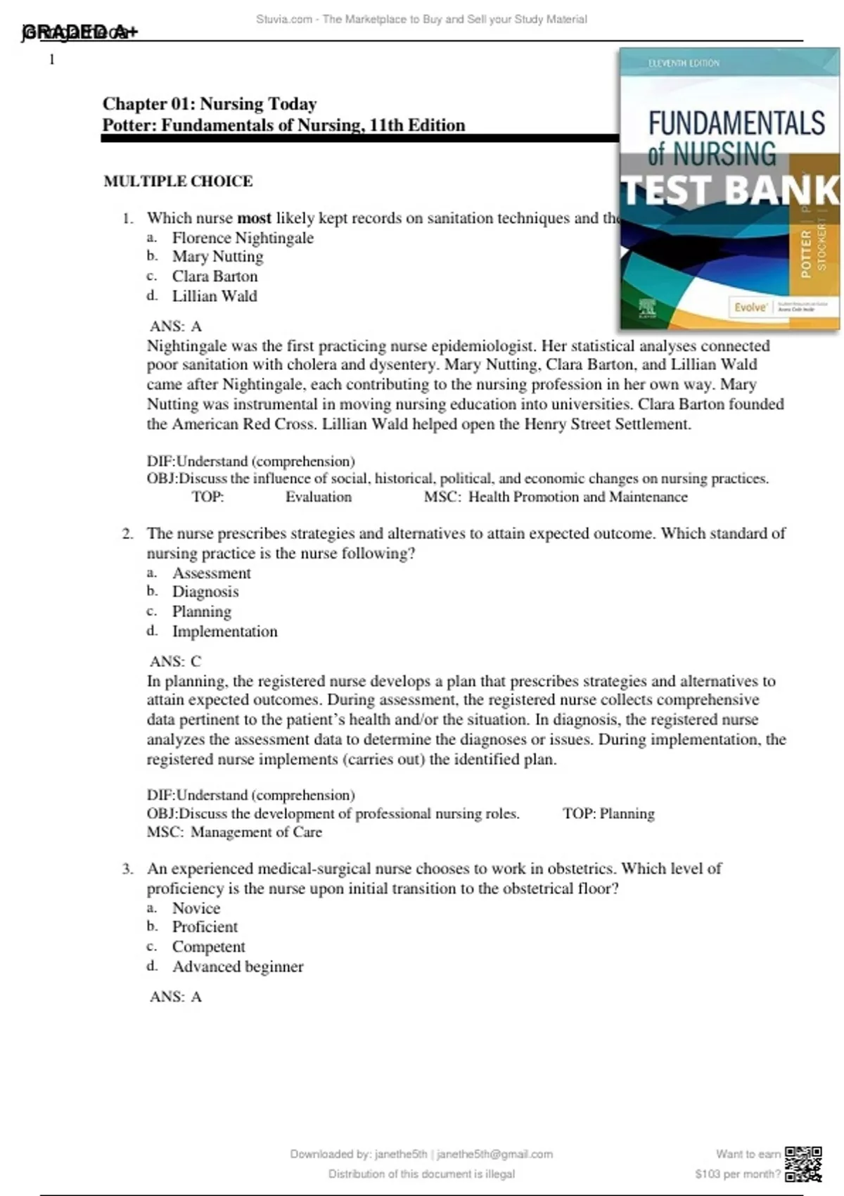 1. Which nurse most likely kept records on sanitation techniques and the effects on health? a. Florence Nightingale b. Mary Nutting c. Clara Barton d. Lillian Wald ANS: A Nightingale was the first practicing nurse epidemiologist. Her statistical analyses connected poor sanitation with cholera and dysentery. Mary Nutting, Clara Barton, and Lillian Wald came after Nightingale, each contributing to the nursing profession in her own way. Mary Nutting was instrumental in moving nursing education into universities. Clara Barton founded the American Red Cross. Lillian Wald helped open the Henry Street Settlement. DIF:Understand (comprehension) OBJ:Discuss the influence of social, historical, political, and economic changes on nursing practices. TOP: Evaluation MSC: Health Promotion and Maintenance 2. The nurse prescribes strategies and alternatives to attain expected outcome. Which standard of nursing practice is the nurse following? a. Assessment b. Diagnosis c. Planning d. Implementation ANS: C In planning, the registered nurse develops a plan that prescribes strategies and alternatives to attain expected outcomes. During assessment, the registered nurse collects comprehensive data pertinent to the patient’s health and/or the situation. In diagnosis, the registered nurse analyzes the assessment data to determine the diagnoses or issues. During implementation, the registered nurse implements (carries out) the identified plan. DIF:Understand (comprehension) OBJ:Discuss the development of professional nursing roles. TOP: Planning MSC: Management of Care 3. An experienced medical-surgical nurse chooses to work in obstetrics. Which level of proficiency is the nurse upon initial transition to the obstetrical floor? a. Novice b. Proficient c. Competent d. Advanced beginner ANS: A S - The Marketplace to Buy and Sell your Study Material Downloaded by: janethe5th | Distribution of this document is illegal Want to earn $103 per month? johngatheca GRADED A+ S - The Marketplace to Buy and Sell your Study Material 2 A beginning nursing student or any nurse entering a situation in which there is no previous level of experience (e.g., an experienced operating room nurse chooses to now practice in home health) is an example of a novice nurse. A proficient nurse perceives a patient’s clinical situation as a whole, is able to assess an entire situation, and can readily transfer knowledge gained from multiple previous experiences to a situation. A competent nurse understands the organization and specific care required by the type of patients (e.g., surgical, oncology, or orthopedic patients). This nurse is a competent practitioner who is able to anticipate nursing care and establish long-range goals. A nurse who has had some level of experience with the situation is an advanced beginner. This experience may only be observational in nature, but the nurse is able to identify meaningful aspects or principles of nursing care. DIF:Apply (application) OBJ:Discuss the development of professional nursing roles. TOP: Evaluation MSC: Management of Care 4. A nurse assesses a patient’s fluid status and decides that the patient needs to drink more fluids. The nurse then encourages the patient to drink more fluids. Which concept is the nurse demonstrating? a. Licensure b. Autonomy c. Certification d. Accountability ANS: B Autonomy is an essential element of professional nursing that involves the initiation of independent nursing interventions without medical orders. To obtain licensure in the United States, the RN candidate must pass the NCLEX-RN. Beyond the NCLEX-RN, the nurse may choose to work toward certification in a specific area of nursing practice. Accountability means that you are responsible, professionally and legally, for the type and quality of nursing care provided. DIF:Apply (application) OBJ:Discuss the roles and career opportunities for nurses. TOP: Implementation MSC: Management of Care 5. A nurse prepares the budget and policies for an intensive care unit. Which role is the nurse implementing? a. Educator b. Manager c. Advocate d. Caregiver ANS: B Downloaded by: janethe5th | Distribution of this document is illegal Want to earn $103 per month? johngatheca GRADED A+ S - The Marketplace to Buy and Sell your Study Material 3 A manager coordinates the activities of members of the nursing staff in delivering nursing care and has personnel, policy, and budgetary responsibility for a specific nursing unit or facility. As an educator, you explain concepts and facts about health, describe the reason for routine care activities, demonstrate procedures such as self-care activities, reinforce learning or patient behavior, and evaluate the patient’s progress in learning. As a patient advocate, you protect your patient’s human and legal rights and provide assistance in asserting these rights if the need arises. As a caregiver, you help patients maintain and regain health, manage disease and symptoms, and attain a maximal level function and independence through the healing process. DIF:Apply (application) OBJ:Discuss the roles and career opportunities for nurses. TOP: Implementation MSC: Management of Care 6. The nurse has been working in the clinical setting for several years as an advanced practice nurse. However, the nurse has a strong desire to pursue research and theory development. To fulfill this desire, which program should the nurse attend? a. Doctor of Nursing Science degree (DNSc) b. Doctor of Philosophy degree (PhD) c. Doctor of Nursing Practice degree (DNP) d. Doctor in the Science of Nursing degree (DSN) ANS: B Some doctoral programs prepare nurses for more rigorous research and theory development and award the research-oriented Doctor of Philosophy (PhD) in nursing. Professional doctoral programs in nursing (DSN or DNSc) prepare graduates to apply research findings to clinical nursing. The DNP is a practice doctorate that prepares advanced practice nurses such as nurse practitioners. DIF:Understan