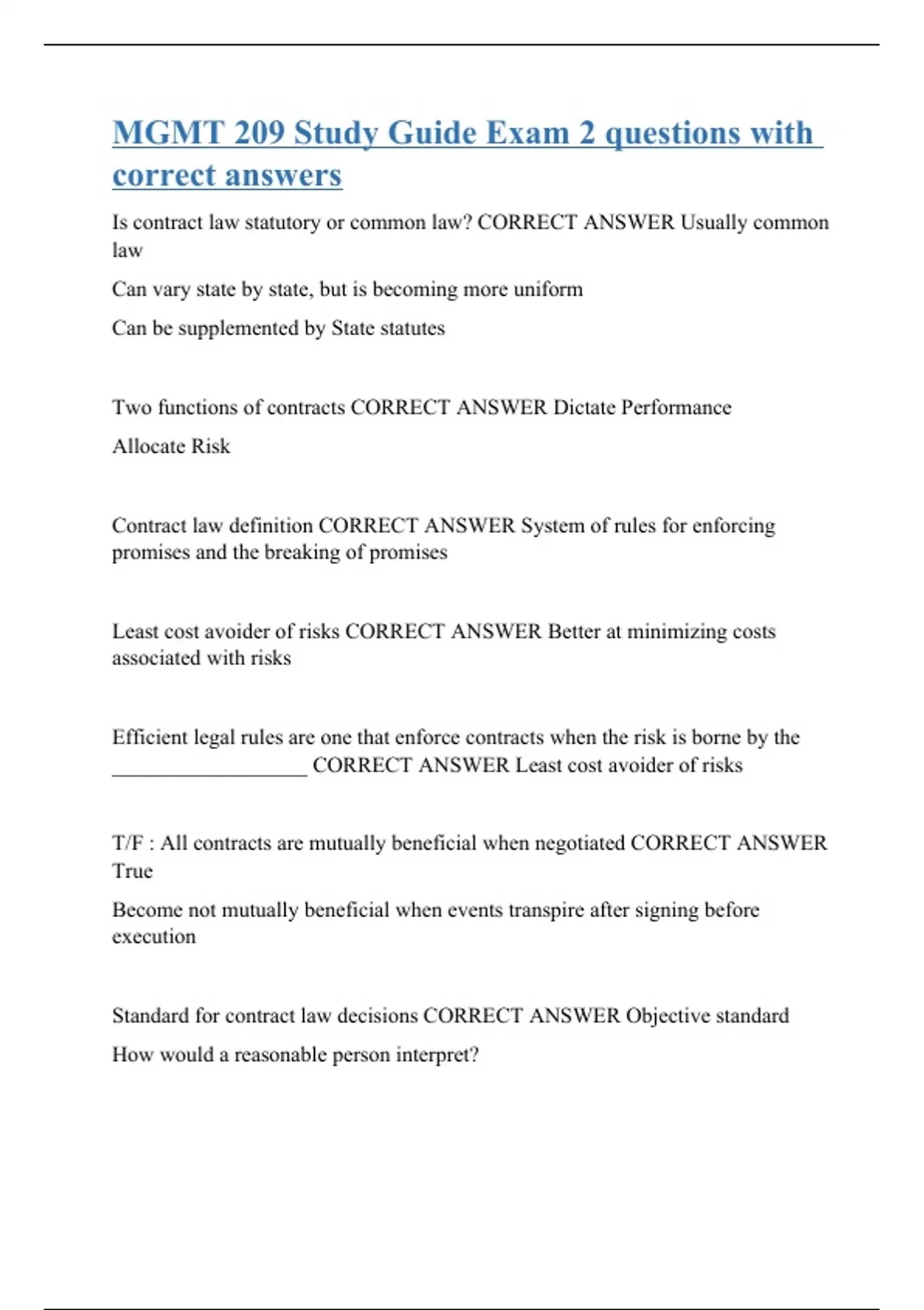Is contract law statutory or common law? CORRECT ANSWER Usually common law Can vary state by state, but is becoming more uniform Can be supplemented by State statutes Two functions of contracts CORRECT ANSWER Dictate Performance Allocate Risk Contract law definition CORRECT ANSWER System of rules for enforcing promises and the breaking of promises Least cost avoider of risks CORRECT ANSWER Better at minimizing costs associated with risks Efficient legal rules are one that enforce contracts when the risk is borne by the __________________ CORRECT ANSWER Least cost avoider of risks T/F : All contracts are mutually beneficial when negotiated CORRECT ANSWER True Become not mutually beneficial when events transpire after signing before execution