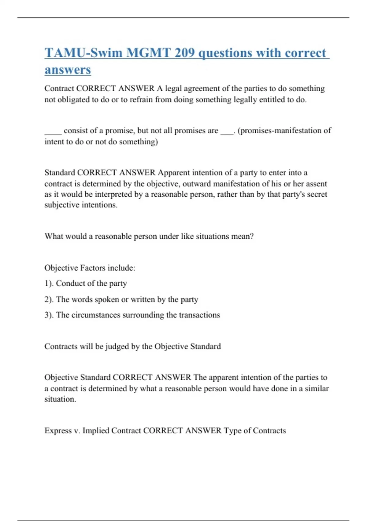 Contract CORRECT ANSWER A legal agreement of the parties to do something not obligated to do or to refrain from doing something legally entitled to do. ____ consist of a promise, but not all promises are ___. (promises-manifestation of intent to do or not do something) Standard CORRECT ANSWER Apparent intention of a party to enter into a contract is determined by the objective, outward manifestation of his or her assent as it would be interpreted by a reasonable person, rather than by that party's secret subjective intentions. What would a reasonable person under like situations mean? Objective Factors include: 1). Conduct of the party 2). The words spoken or written by the party 3). The circumstances surrounding the transactions Contracts will be judged by the Objective Standard Objective Standard CORRECT ANSWER The apparent intention of the parties to a contract is determined by what a reasonable person would have done in a similar situation. Express v. Implied Contract CORRECT ANSWER Type