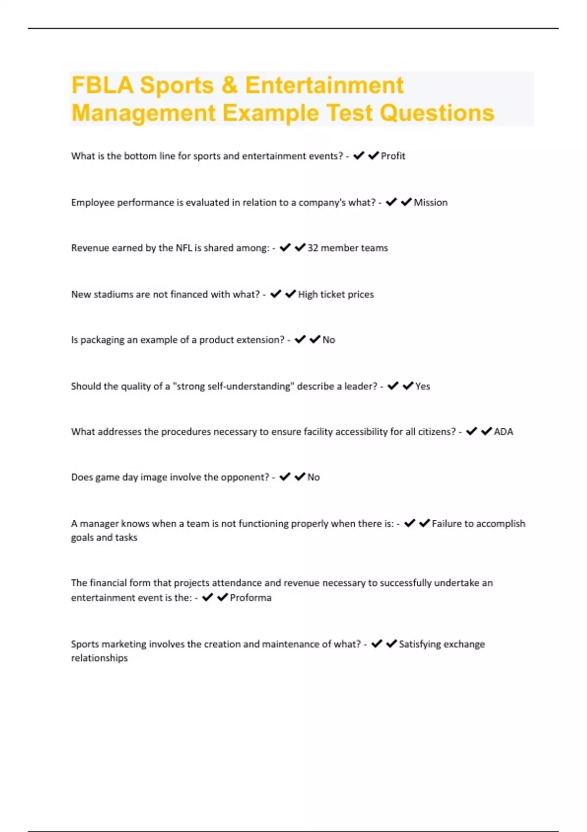 FBLA Sports & Entertainment Management Example Test Questions With 100% Correct Answers.