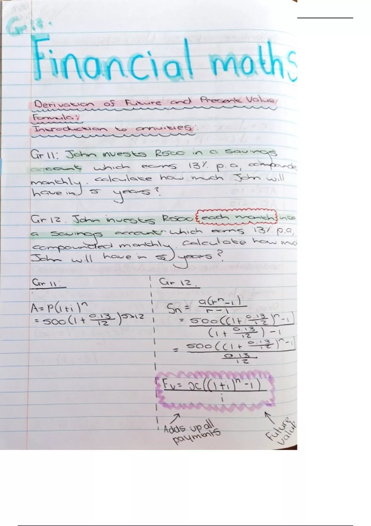 Handwritten notes on grade 12 Financial Mathematics, which contains colourful and a easy to understand guide on all the information you need to ace this topic. Math made easy just for you.