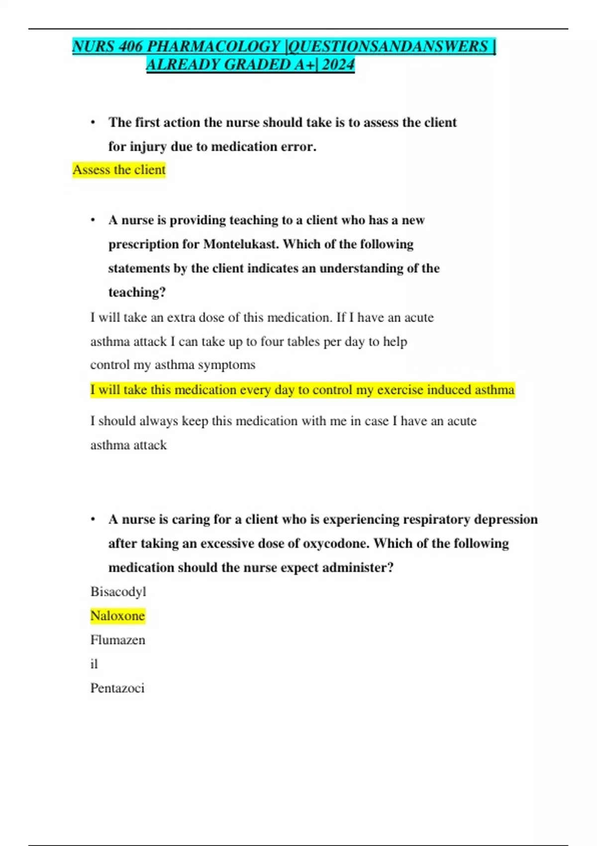 NURS 406 PHARMACOLOGY |QUESTIONSANDANSWERS | ALREADY GRADED A+| 2024 • The first action the nurse should take is to assess the client for injury due to medication error. Assess the client • A nurse is providing teaching to a client who has a new prescription for Montelukast. Which of the following statements by the client indicates an understanding of the teaching? I will take an extra dose of this medication. If I have an acute asthma attack I can take up to four tables per day to help control my asthma symptoms I will take this medication every day to control my exercise induced asthma I should always keep this medication with me in case I have an acute asthma attack • A nurse is caring for a client who is experiencing respiratory depression after taking an excessive dose of oxycodone. Which of the following medication should the nurse expect administer? Bisacodyl Naloxone Flumazen il Pentazoci ne • A nurse is teaching the partner of a client who has diabetes mellitus how to manager episodes of severe hypoglycemia when the clients is unresponsive, which of the following actions should the nurse instruct the partner to take first? Administer glucagon IM to the client Call emergency medical services Check the clients blood glucose level Transport the client to the emergency department • A nurse is reviewing the medical record of a client who received medications 1 hr ago and reports having chest pain. The nurse should recognize that chest pain can be an adverse effect of which of the following medication? Albuterol Furosemi de Digoxin Atenolol • A nurse is providing teaching to a client who has a new prescription for ranitidine for the treatment of Zollinger-Ellison syndrome. The nurse should explain to the client that ranitidine treats ulcers through which of the following actions? It decreases stomach motility It reduces gastric acid produc