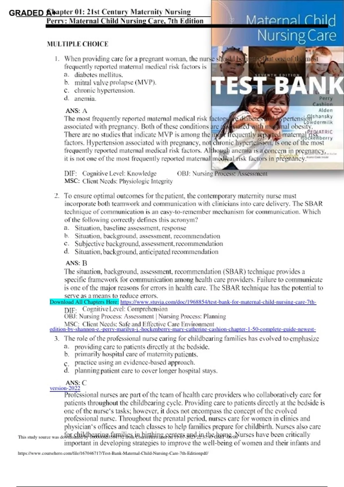 Maternal Child Nursing Care 7th Edition Perry Test Bank Chapter 1-50 | Complete Guide Newest Version 2023 This is NOT a book! This is a Test Bank (Study Questions) to help you study for your Tests. No delay, the download is quick and instantaneous right after you checkout! Test banks can give you the tools you need to help you study better. This download has no waiting period so that means that you will be able to download this test bank right away.