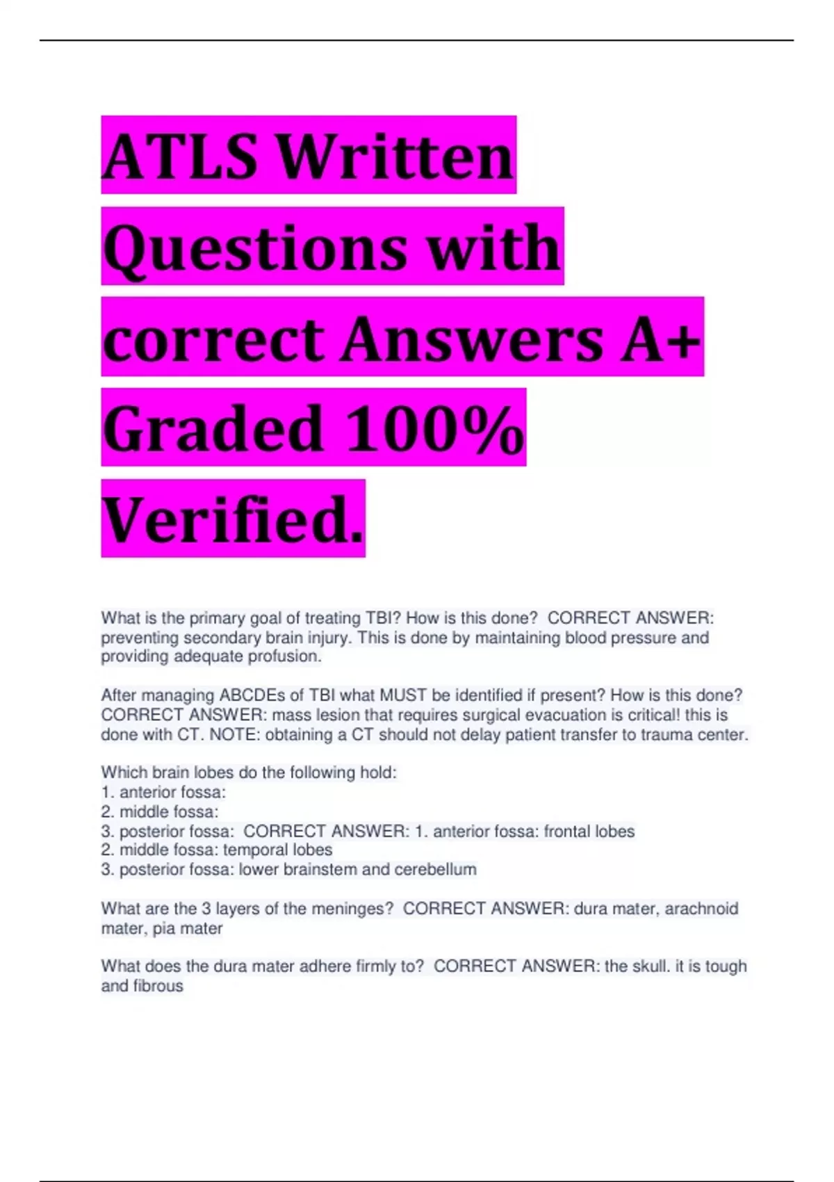 ATLS Written Questions with correct Answers A+ Graded 100% Verified. What is the primary goal of treating TBI? How is this done? CORRECT ANSWER: preventing secondary brain injury. This is done by maintaining blood pressure and providing adequate profusion. After managing ABCDEs of TBI what MUST be identified if present? How is this done? CORRECT ANSWER: mass lesion that requires surgical evacuation is critical! this is done with CT. NOTE: obtaining a CT should not delay patient transfer to trauma center. Which brain lobes do the following hold: 1. anterior fossa: 2. middle fossa: 3. posterior fossa: CORRECT ANSWER: 1. anterior fossa: frontal lobes 2. middle fossa: temporal lobes 3. posterior fossa: lower brainstem and cerebellum What are the 3 layers of the meninges? CORRECT ANSWER: dura mater, arachnoid mater, pia mater What does the dura mater adhere firmly to? CORRECT ANSWER: the skull. it is tough and fibrous What layer of the meninges splits into two leaves as specific sites to enclose large venous sinuses? What do these sinuses do? CORRECT ANSWER: dura mater. these sinuses provide major venous drainage from the brain. What is the midline sinus of of the brain that splits into two sinuses: bilateral transverse and sigmoid sinus? What side are these bigger on? CORRECT ANSWER: The main sinus enclosed by the dura major is the midline superior sagital sinus. This splits into the sigmoid and bilateral transverse sinuses which are larger on the right side. What are the arteries that lie between the skull and the dura mater (epidural space)? CORRECT ANSWER: meningeal arteries. What is the most commonly injured meningeal artery and where is it located? CORRECT ANSWER: middle meningeal artery. Located over the temporal fossa T/F: the arachnoid mater is fused to the dura mater? CORRECT ANSWER: FALSE: not attached. This produces a potential space for a subdural hematoma In a subdural hematoma, what is the cause? CORRECT ANSWER: injury to bridging veins that extend from brain surface to the sinuses within the dura. _______ fills the space between the arachnoid and pia mater? CORRECT ANSWER: CSF. this cushions the brain and spinal cord. What location of brain hemorrhage is frequently seen in brain contusion or injury to major blood vessels at base of brain? CORRECT ANSWER: subarachnoid. The ____ and _____ contain the reticular activating system which is responsible for ____. CORRECT ANSWER: midbrain and upper pons state of alertness What important function resides in the medulla? CORRECT ANSWER: cardiorespiratory centers. What important functions are in the following brain segments: 1. left hemisphere: 2. frontal lobe: 3. parietal lobe: 4. temporal: CORRECT ANSWER: 1. left hemisphere: language center 2. frontal lobe: executive function, emotions, motor 3. parietal lobe: sensory function/spatial orientation 4. temporal: memory functions What divides the brain into supratentorial and infratentorial compartments? CORRECT ANSWER: tentorium cerebelli. (tent over cerebellum) What is the physiology behind a blown pupil? CORRECT ANSWER: blown pupil: dilation of pupil -CN III runs along the tentorium cerebelli. parasympathetic fibers that constrict the pupil run along CN III (oculomotor). When temporal lobe is herniated, it can compress these fibers. Unapposed sympathetic activity causes pupillary dilation. What is the tentorial notch/hiatus CORRECT ANSWER: this is where the midbrain passes through into the infratentorial compartment. what part of the brain most commonly herniates through the tentorial notch? CORRECT ANSWER: Uncus (medial part of temporal lobe) does weakness occur on the same or opposite side of the uncal herniation? CORRECT ANSWER: OPPOSITE. the corticospinal tract of the midbrain is compressed and then crosses at the foramen magnum. state: Ipsilateral/contralateral ____ pupillary dilation associated with _____ hemiparesis is the classic sign of uncial herniation. CORRECT ANSWER: ipsi contra average ICP is _____ mmHg. CORRECT ANSWER: 10 The monro-kellie doctrine states that the total volume of intracranial contents must remain constant, because the cranium is ___ CORRECT ANSWER: a rigid, non expandable container. The monro-kellie doctrine states that _____ and _____ may be compressed out of the skull providing a degree of buffering. CORRECT ANSWER: CSF and venous blood. Once the CSF and venous blood reach a certain level of displacement the ICP rapidly increases. What is the equation for CPP (cerebral perfusion pressure)? CORRECT ANSWER: CPP=MAP-ICP in TBI, Every effort should be made to reduce ______, while normalizing ____, ___, and _____. CORRECT ANSWER: ICP MAP, oxygenation, intravascular volume What GCS ranges for the following classes: 1. Minor 2. Moderate 3. Severe CORRECT ANSWER: 1. 13-15 2. 9-12 3. 3-8 What nerve palsy may occur with basilar skull fracture? CORRECT ANSWER: seventh nerve. A GCS of ___ is accepted definition of coma? CORRECT ANSWER: 8 or less How do you assess a GCS of someone with asymmetric responses? CORRECT ANSWER: Use the best possible because this will be the best predictor of outcome Basilar fractures of the skull usually require what type of imaging? CORRECT ANSWER: this requires CT with bone-window setting. What are the typical clinical signs of basilar skull fractures? CORRECT ANSWER: rbital ecchymosis (raccoon eyes) 2. retroauriculor ecchymosis (battle sign) 3. CSF leak from nose or ears 4. 7th or 8th CN dysfunction (facial paralysis and hearing loss) What should be a primary consideration for any patient with a skull fracture, especially a linear skull fracture? CORRECT ANSWER: hematoma. linear skull fracture increases likelihood of intracranial hematoma by about 400x What mechanism is common with diffuse axonal injury and what is the likely outcome? CORRECT ANSWER: these injury often occur with high velocity or deceleration injures. They appear as diffuse cerebral hemorrhage often between grey and white matter. These are associated with variable but 