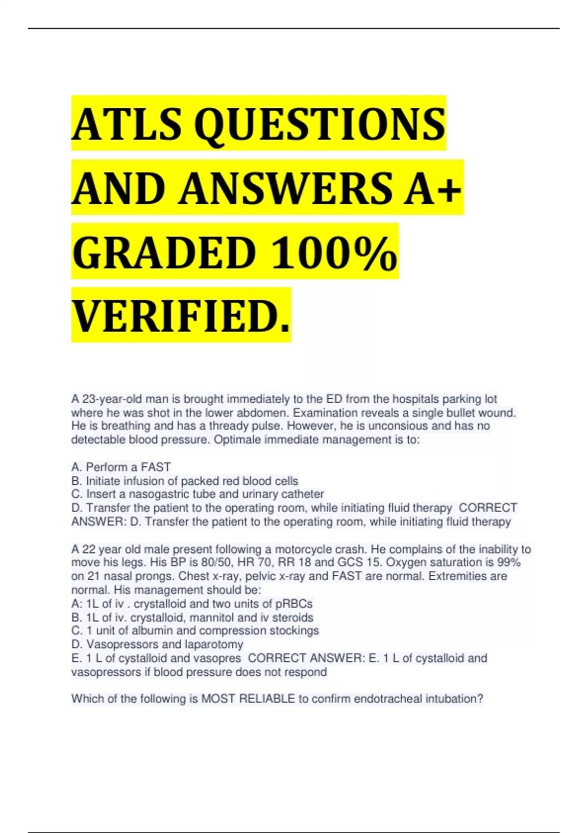 ATLS QUESTIONS AND ANSWERS A+ GRADED 100% VERIFIED. A 23-year-old man is brought immediately to the ED from the hospitals parking lot where he was shot in the lower abdomen. Examination reveals a single bullet wound. He is breathing and has a thready pulse. However, he is unconsious and has no detectable blood pressure. Optimale immediate management is to: A. Perform a FAST B. Initiate infusion of packed red blood cells C. Insert a nasogastric tube and urinary catheter D. Transfer the patient to the operating room, while initiating fluid therapy CORRECT ANSWER: D. Transfer the patient to the operating room, while initiating fluid therapy A 22 year old male present following a motorcycle crash. He complains of the inability to move his legs. His BP is 80/50, HR 70, RR 18 and GCS 15. Oxygen saturation is 99% on 21 nasal prongs. Chest x-ray, pelvic x-ray and FAST are normal. Extremities are normal. His management should be: A: 1L of iv . crystalloid and two units of pRBCs B. 1L of iv. crystalloid, mannitol and iv steroids C. 1 unit of albumin and compression stockings D. Vasopressors and laparotomy E. 1 L of cystalloid and vasopres CORRECT ANSWER: E. 1 L of cystalloid and vasopressors if blood pressure does not respond Which of the following is MOST RELIABLE to confirm endotracheal intubation? a. presence of breath sounds bilaterally b. absence of borborygmi in the epigatrium on ascultation c. presence of CO2 in exhaled air via capnography d. appearance of fog in the endotracheal tube e. chest xray with endotracheal tube tip appearing above the carina CORRECT ANSWER: e. chest xray with endotracheal tube tip appearing above the carina A 6 month old infant, being held in her mothers arms, is ejected on impact from a vehicle that is struck head on by an oncoming car traveling at 64kph. The infant arrives in the ED with multiple facial injuries, is lethargic, and is in severe respiratoy distress. Respiratory support is not effective using a bag mask device, and her oxygen saturation is falling. Repeated attempts at orotracheal intubation are unsuccessful. the most appropriate procedure to perform next is: A.Administer heliox and CORRECT ANSWER: E. Perform needle cricothyroidotomy with jet insufflation A 28 year olf male is brought to the ED. He was involved in a fight, during which he was beaten with a wooden stick. His chest shows multiple severe bruises. His arway is clear, resp rate is 22, hear rate 126, and systolic blood pressure is 90 mmHG. Which of the following should be performed during the primary survey a. glasgow coma b. tetanus status c. cervical spine xray d. blood alcohol level e. rectal exam CORRECT ANSWER: a. glasgow coma an 18yo male is brought to the emergency department after being dumped by a large wave while surfing. He landed head first on the firm beach sand. His vital signs are blood pressure 85/60 mmHg, heart rate 60, and respiratory rate 18; he is unable to move his lower extremities. He appears calm and asks if he will ever walk again. The most appropriate next step is to: a. reassure patient that he will walk again b. proceed to a more detailed neuro exam c. obtain c spin xrays d. begin infusion of va CORRECT ANSWER: e. begin bolus of warm IV crystalloid Whic one of the following statements is true regarding access in pediatric resuscitation? a. intraosseous access should be considered only after 5 percutaneous attempts b. cutdown at teh ankle is the preferred initial access technique c. internal jugular cannulation is the next preferred option when percutaneous venous access fails d. intraosseous cannulation should be the first choice e. blood transfusion can be delivered through intraosseous access CORRECT ANSWER: e. blood transfusion can be delivered through intraosseous access a 35 year old female ustains multiple linjuries in a MVA and is transported to a small hospital. She has a GCS of V2E2M2. Spinal motion restrictions are in place. ET is performed, IV and wamred fluids are administered. She remains hemodynamically normal, and preparations are made to transfer to another facility for definitive neuro care. Which of the following tests or treatment should occur before transport? a. ct abdomen and chest b. chest xray c. lateral cervical spine xray d. admin of methly CORRECT ANSWER: b. chest xray A 22 year old male sustains a shotgun wound to the left shoulder and chest at close range. His BP is 80/40mmHg and his HR is 130bpm. Fluid resusciation is initiated, his BP increases to 122/84, and HR decreases to 100bpm. He is tachypneic with RR of 28. On physical examination, his breath sounds are decreased at the left upper chest with dullness on percussion. A tube thoracostomy is inserted in the fifth intercostal space with the return of 200ml of blood and no air leak. The most appropriate n CORRECT ANSWER: e. repeat the physical exam of the chest A 22 yo male is brought to the ED after being assaulted in a bar. On intial exam, his vital signs are normal and his Glasgow Coma scale is V5E4M6. A definite indication for a head CT is a. prescence of hemotympanum b. complains of headache c. prescense of 10cm scapl laceration d. prescence of mandibular fracture e. history of assault CORRECT ANSWER: a. prescence of hemotympanum a 23 yo construction worker is brought to the ED after falling more than 9 meters from scaffolding. He is reported to have landed on his feet and then been unable to bear weight. His vital signs are heart 140, blood pressure 96/60 mmHg, resp rate 36. He is complaining of lower abdbominal and lower limb pain, and has obvious deformity of both lower legs with bilateral open tibial fractures. WHich one of the following statements concerning this patient is true? a. pelvic injury can be ruled out, b CORRECT ANSWER: c. xrays of the patient chest and pevlic are important adjuncts in the inital assessment 25 yo female in the third trimester of preganacy is brought to the ED following a high speed MVA. She is conscious, and her vital signs are RR 16, HR 12