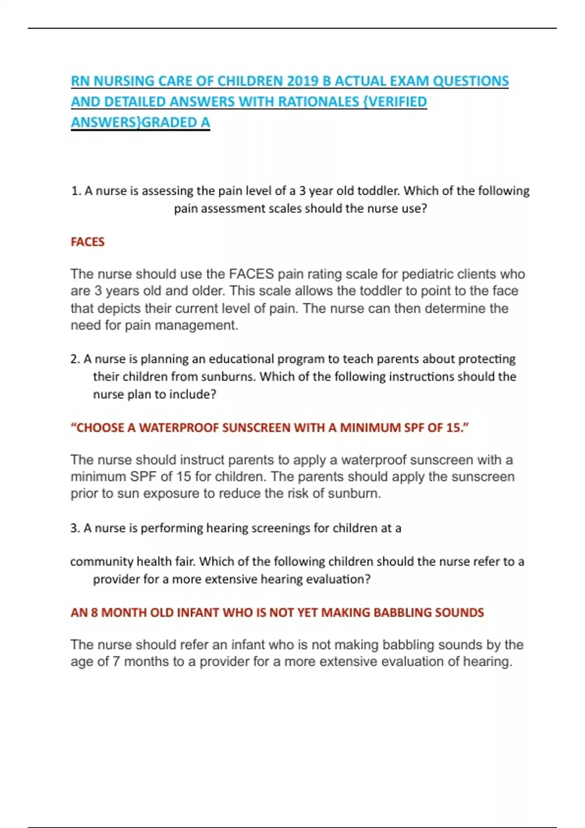 RN NURSING CARE OF CHILDREN 2019 B ACTUAL EXAM QUESTIONS AND DETAILED ANSWERS WITH RATIONALES {VERIFIED ANSWERS}GRADED A
